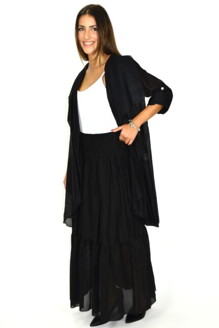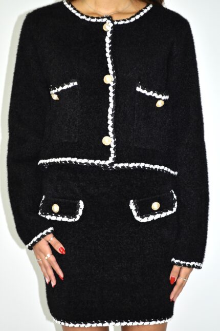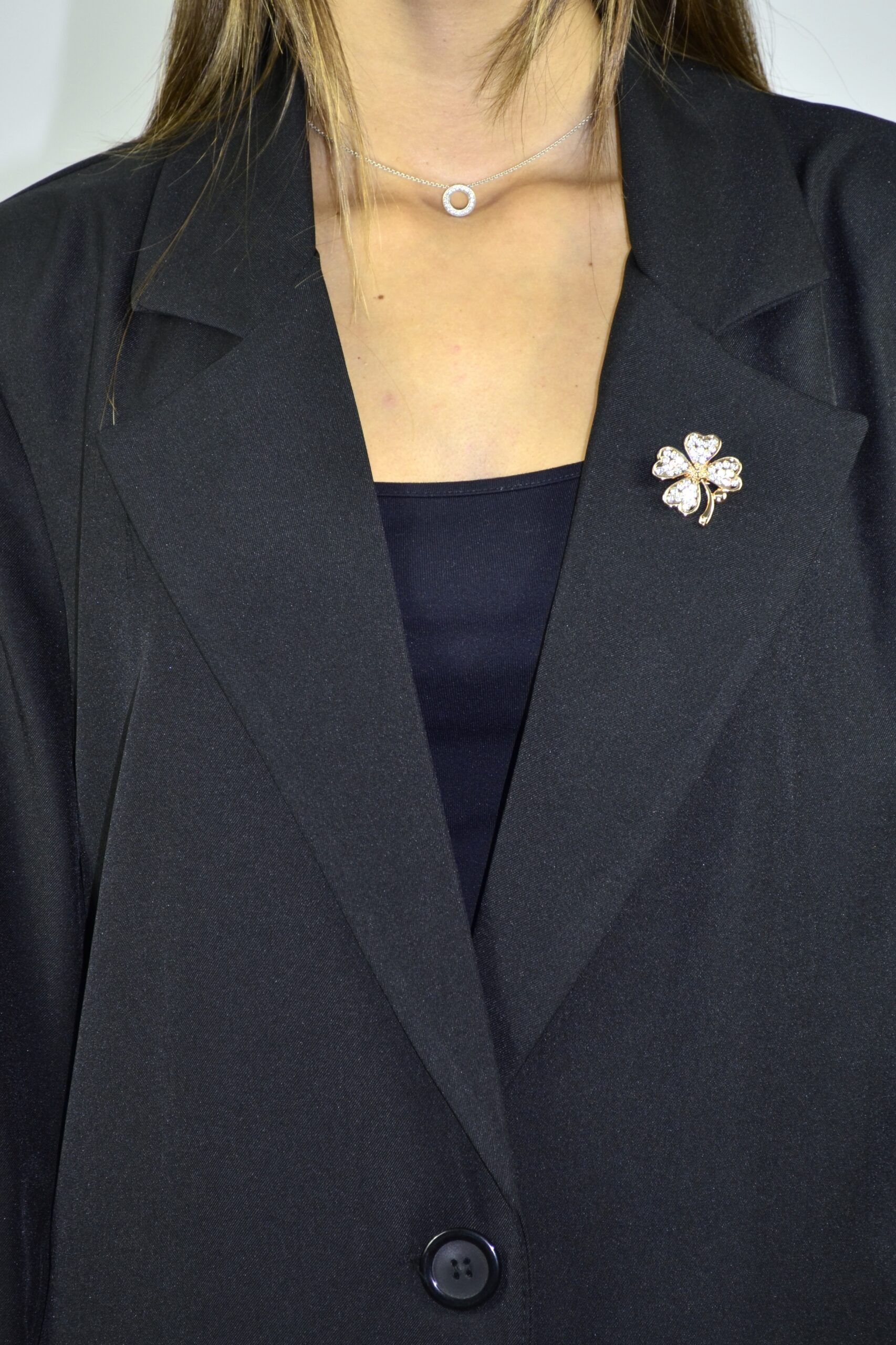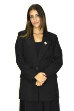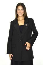 Blazer preto de corte clássico com lapela larga e um botão frontal. Apresenta bolsos com aba e ligeiro volume nos ombros, proporcionando estrutura e elegância. O detalhe do alfinete decorativo em forma de flor acrescenta um toque feminino e sofisticado.