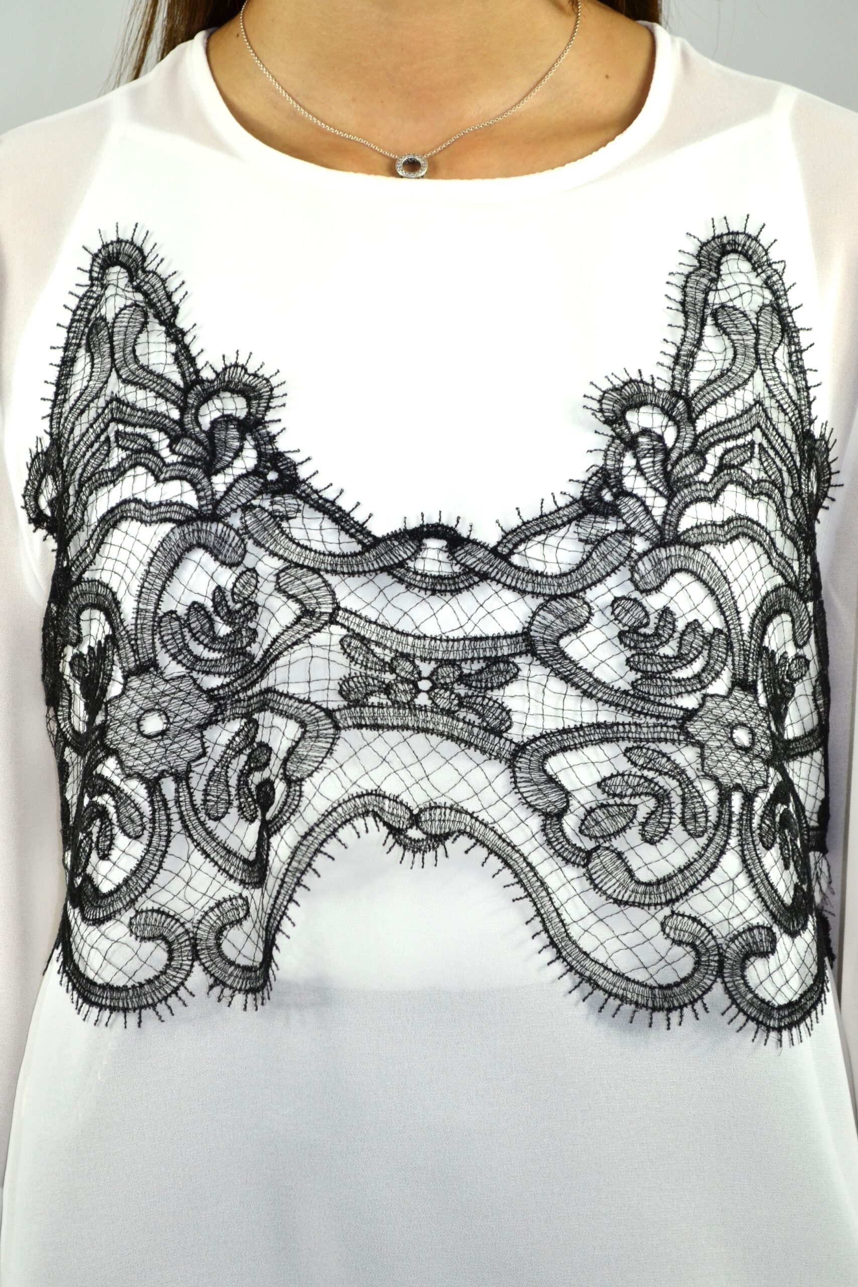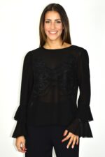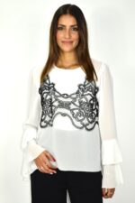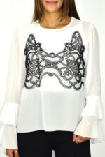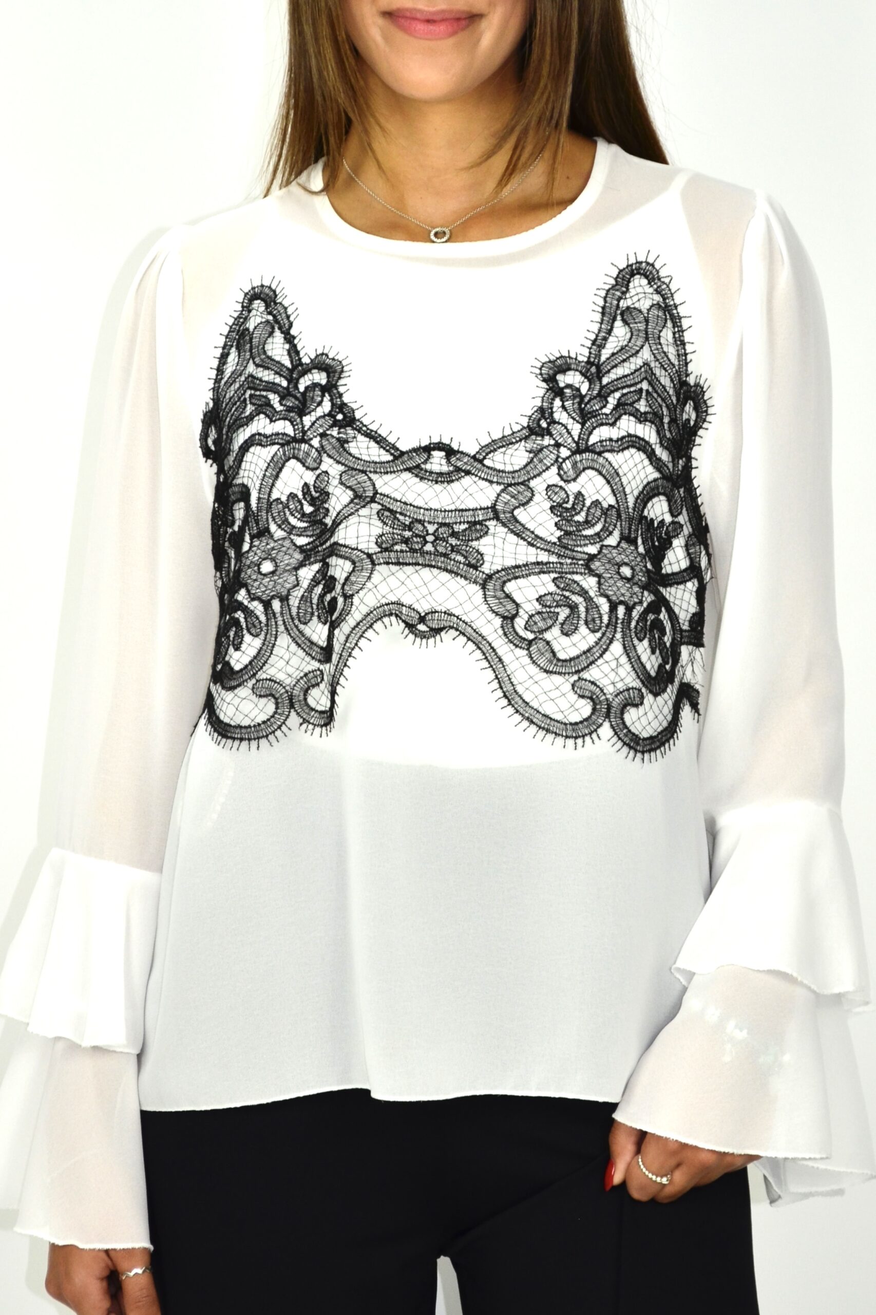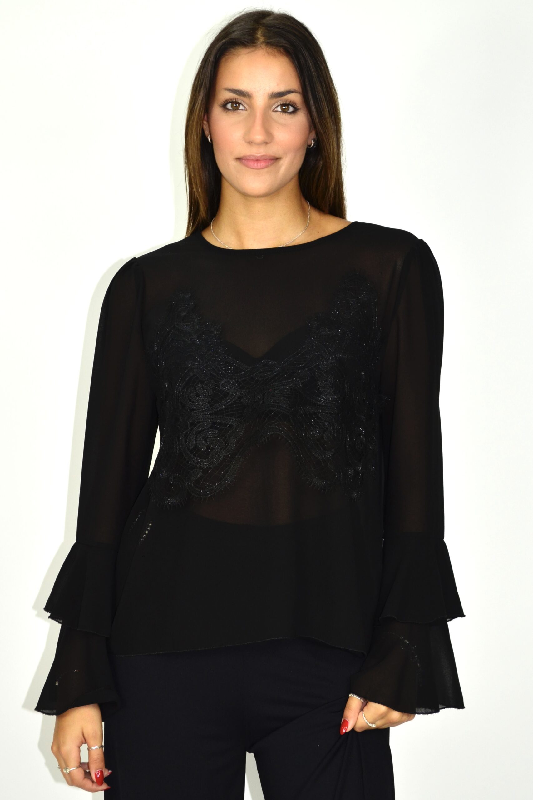 Blusa em chiffon com aplicação de renda na frente. Mangas compridas com punhos em folho duplo e decote redondo e corte fluido. Tecido leve e translúcido que confere movimento e elegância.