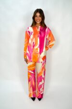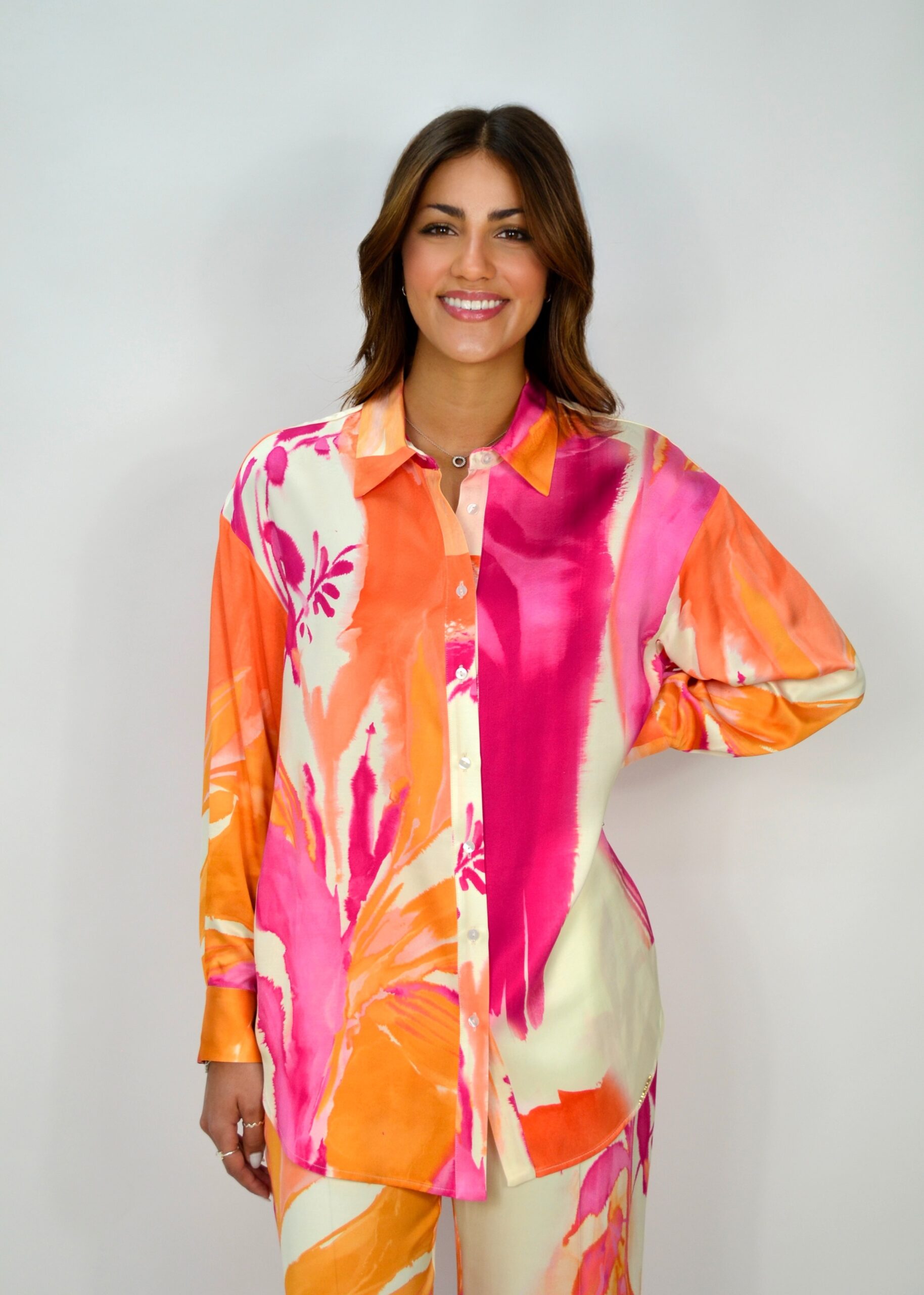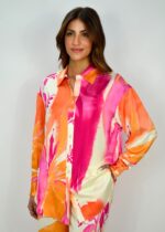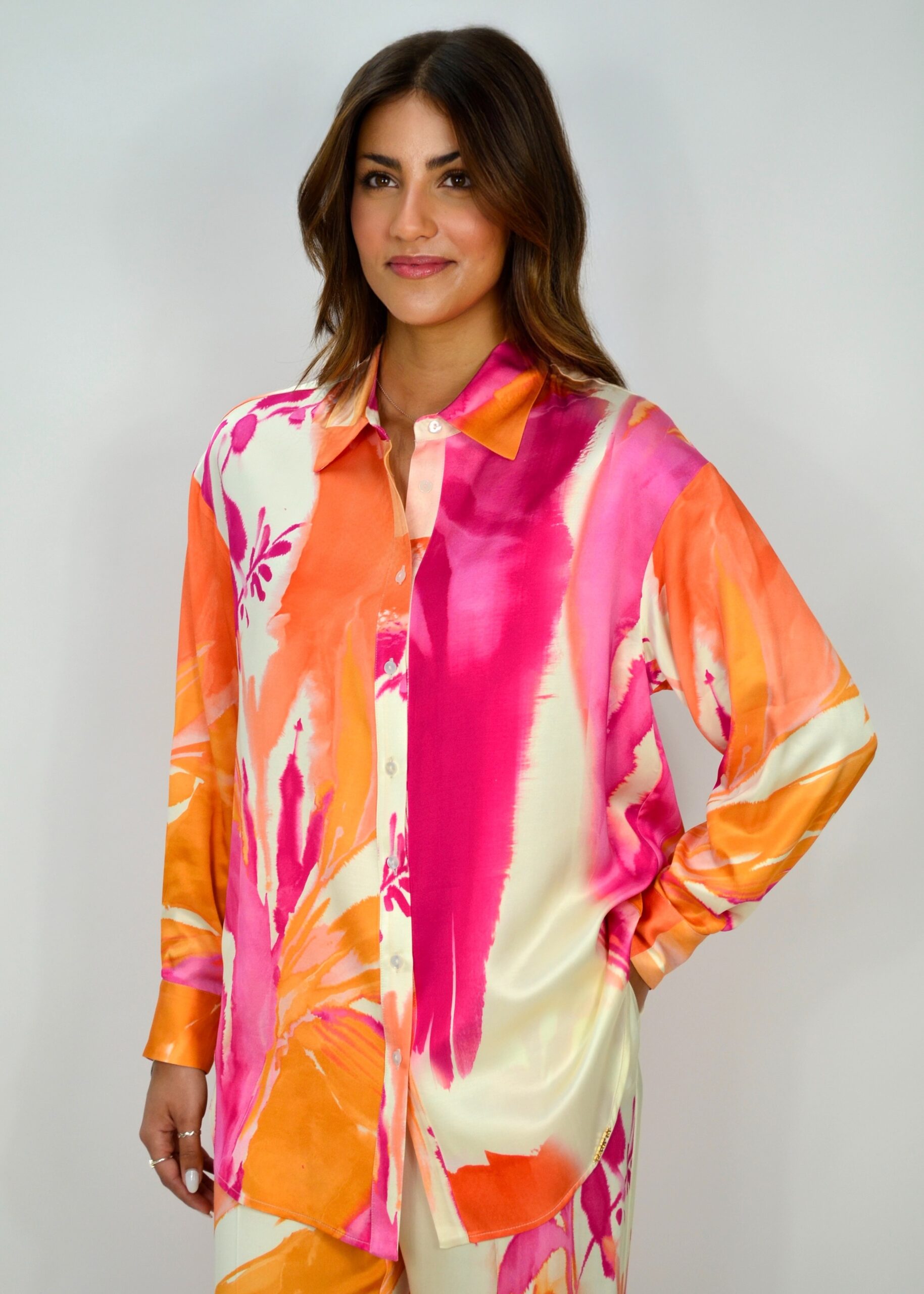 Camisa em tecido acetinado com acabamento fluido, que acompanha o movimento do corpo. Padrão abstrato em tons de rosa, laranja e bege, com efeito pictórico e orgânico. O modelo apresenta gola clássica, fecho frontal com botões e manga comprida com punho estruturado. A silhueta solta garante conforto e um ajuste leve. Ideal para coordenar em conjunto ou com peças neutras, criando um look expressivo e contemporâneo.