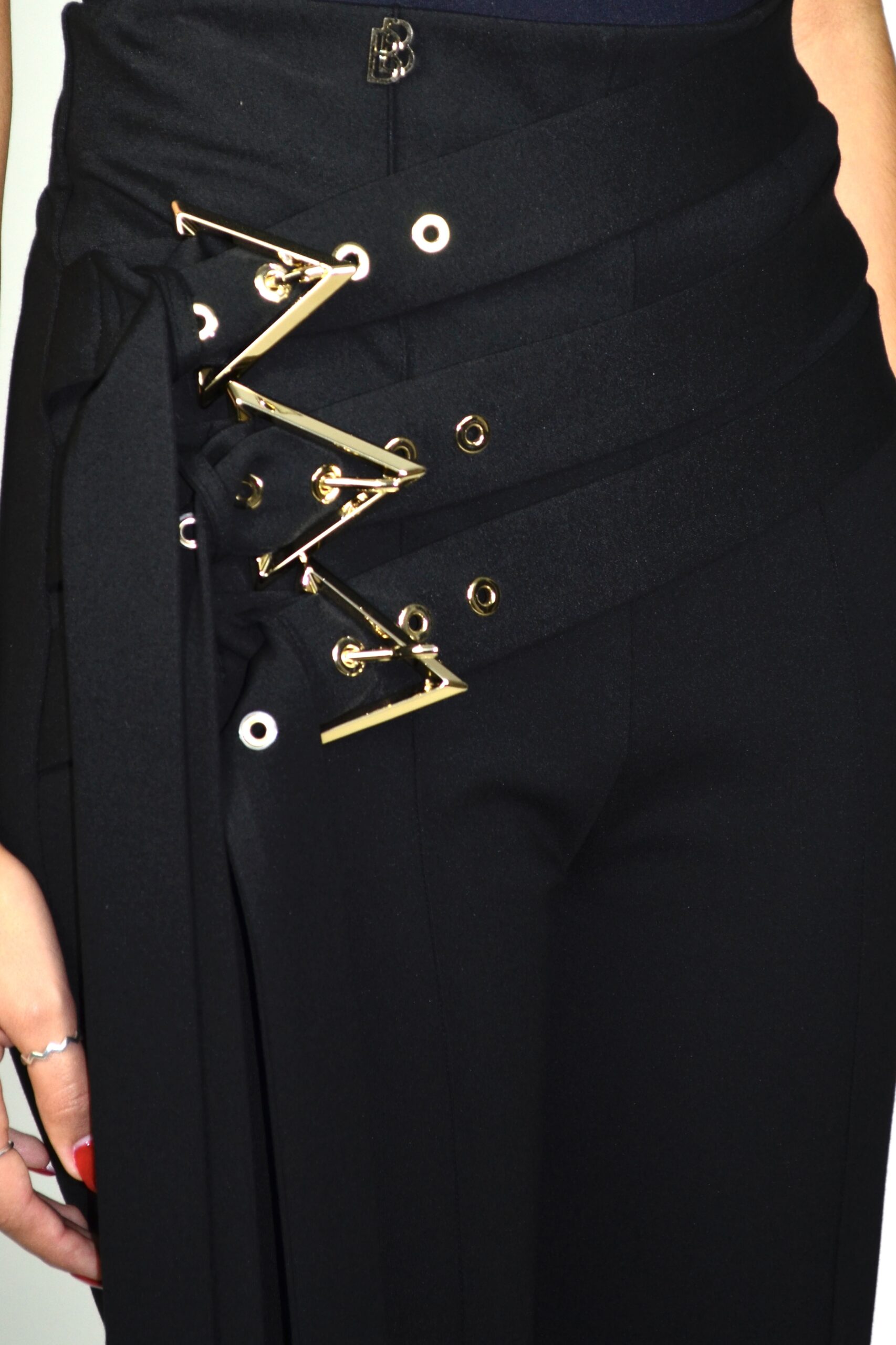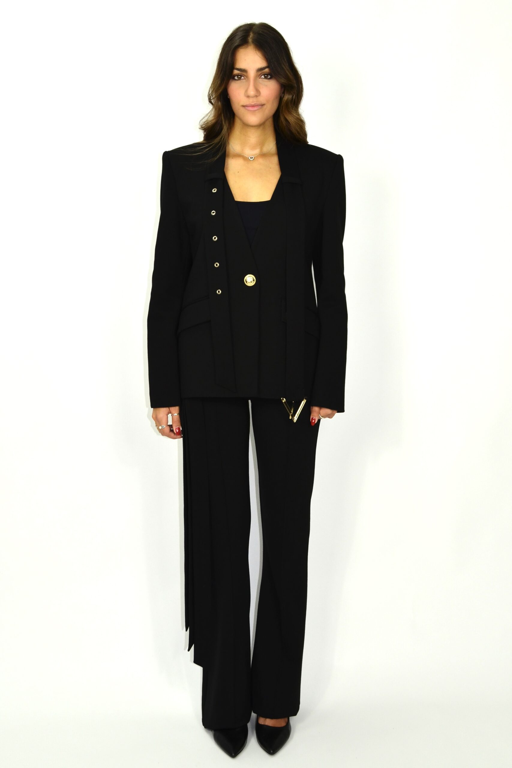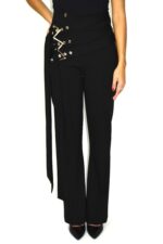 Calças pretas de cintura alta com design statement e detalhe de faixas sobrepostas fixadas por ilhós e aplicações metálicas douradas em forma de “V”. O corte é reto e elegante, criando uma silhueta alongada e poderosa. A construção meticulosa e os acabamentos de alfaiataria conferem sofisticação e modernidade, tornando esta peça perfeita para coordenar com o blazer a condizer ou com tops minimalistas em looks de impacto contemporâneo.