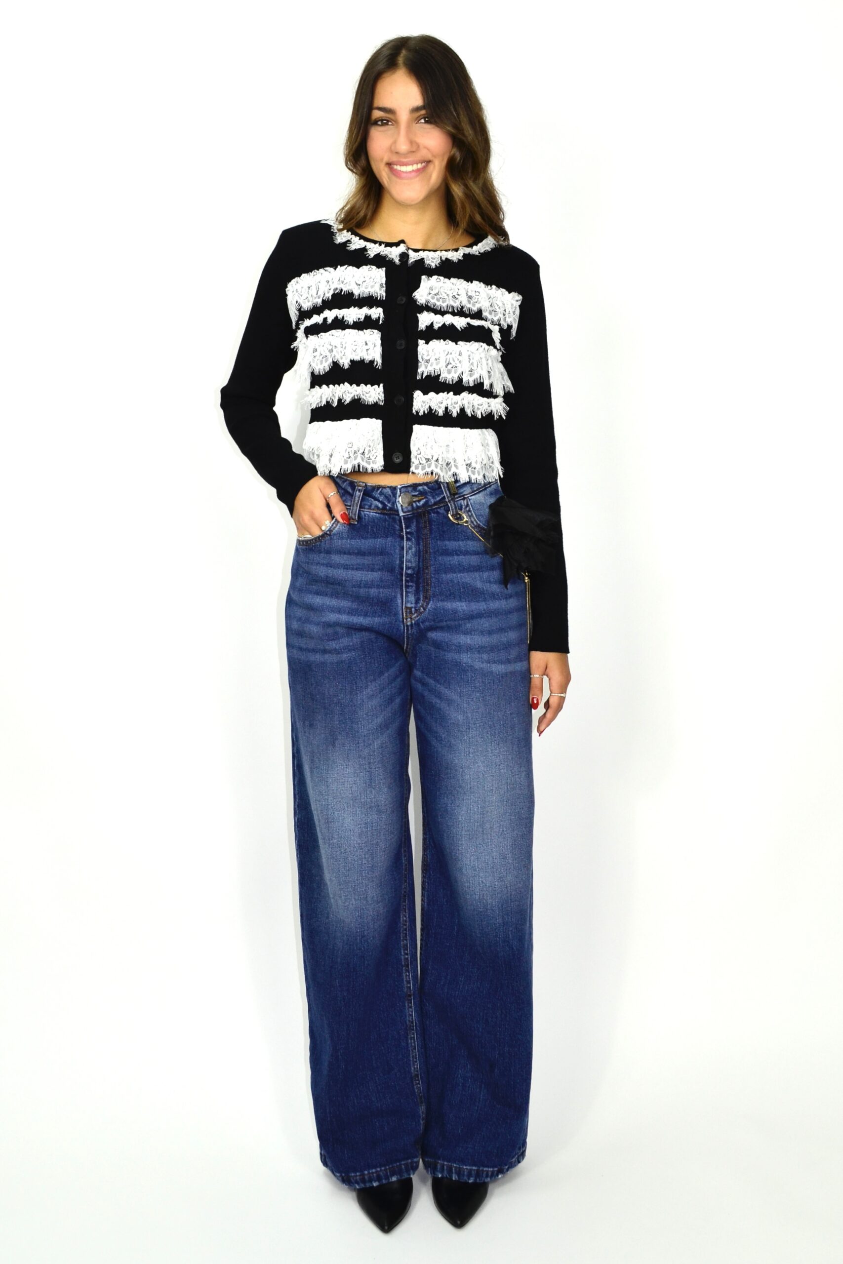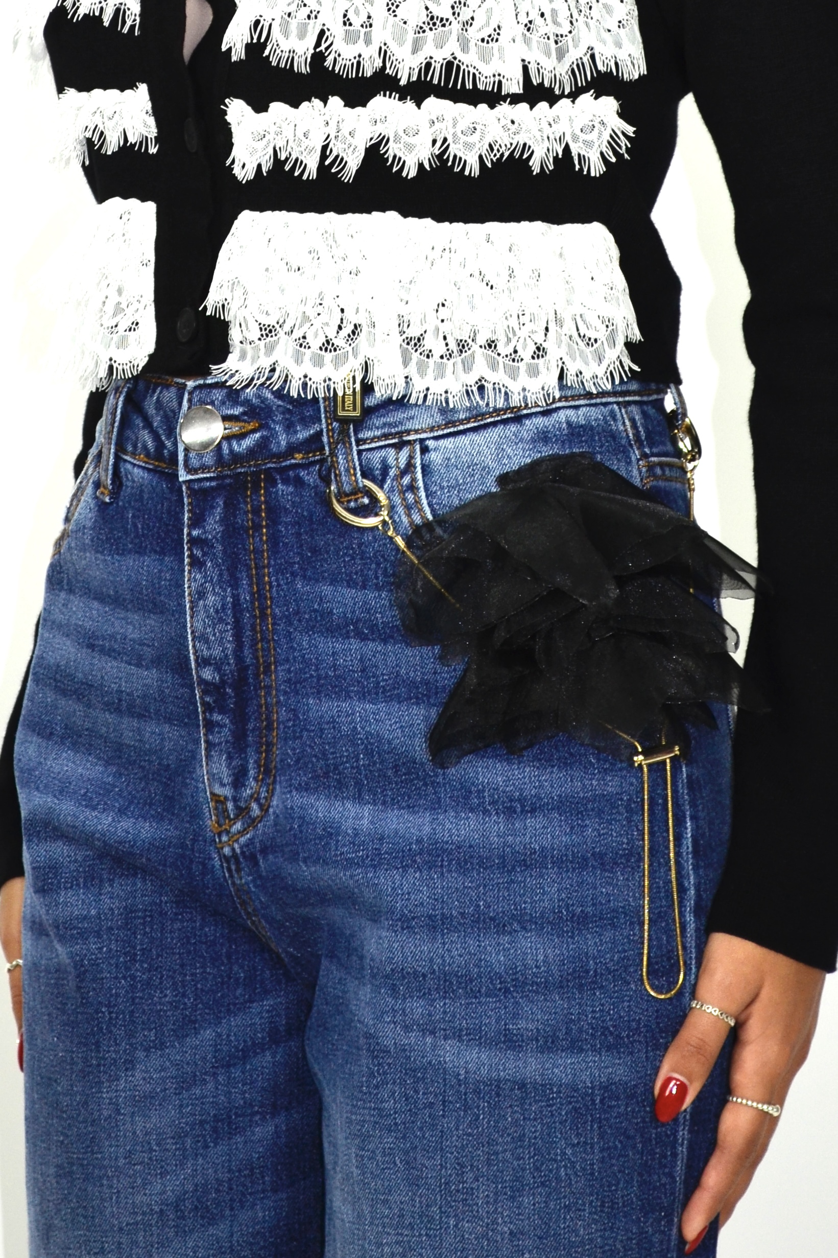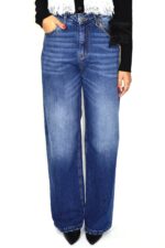 Calças de ganga em tom azul médio com corte largo e cintura subida. O design apresenta lavagem suave e subtil nas pernas, criando um efeito de profundidade e textura. O modelo tem fecho frontal clássico e bolsos funcionais, transmitindo uma estética descontraída e moderna. A silhueta fluida confere movimento e alonga a figura, ideal para coordenar com peças mais estruturadas ou femininas, como um cardigan rendado ou uma camisa leve.