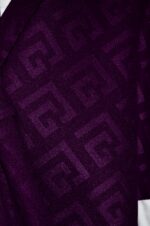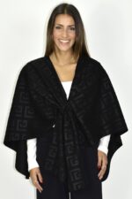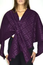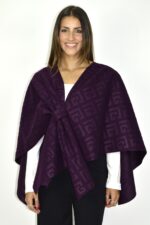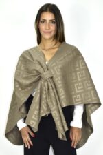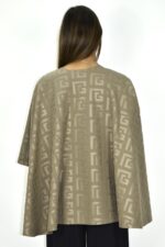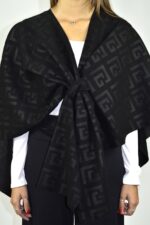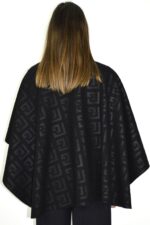 Capa em tecido jacquard com padrão geométrico tom sobre tom. O tecido tem uma textura suave e envolvente, com caimento elegante que valoriza a silhueta. Pode ser usado solto sobre os ombros ou cruzado à frente, criando um efeito sofisticado e contemporâneo.