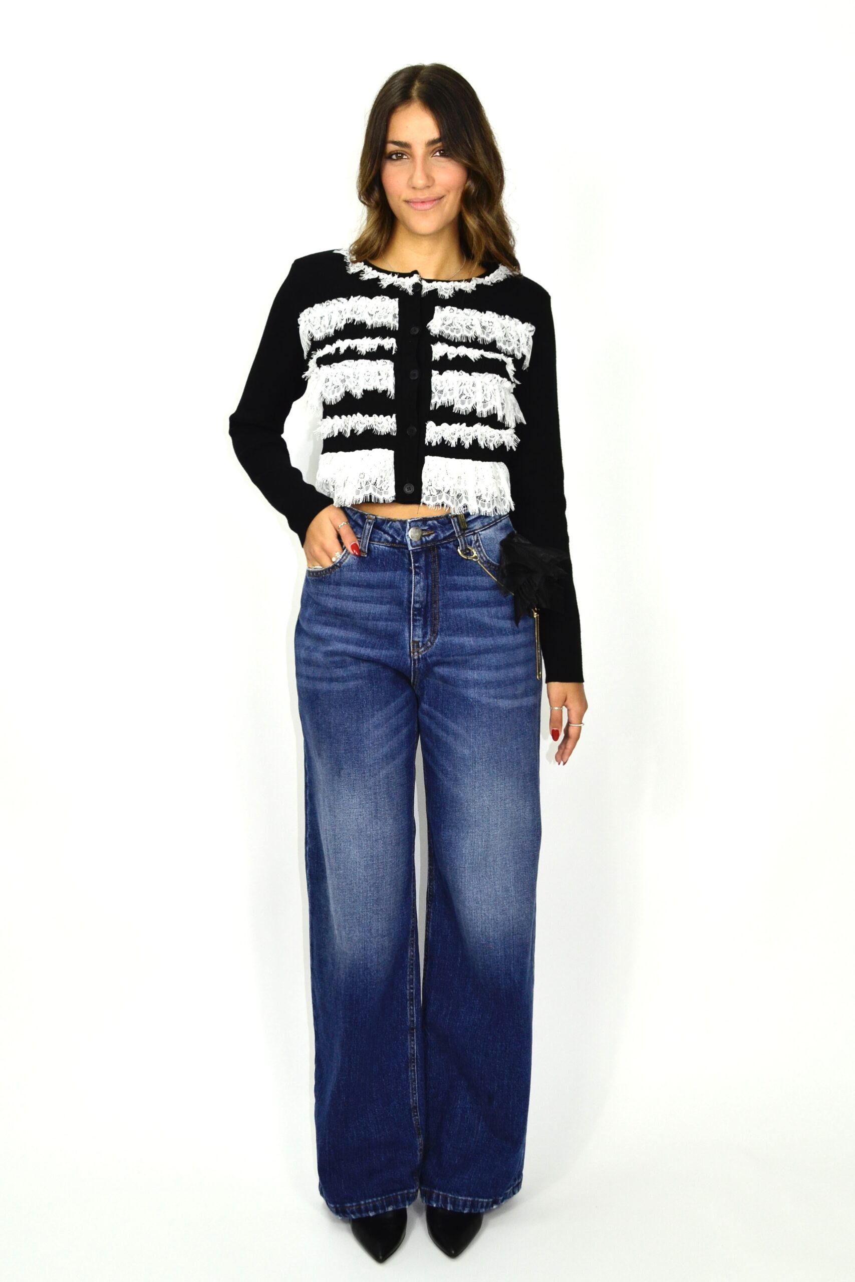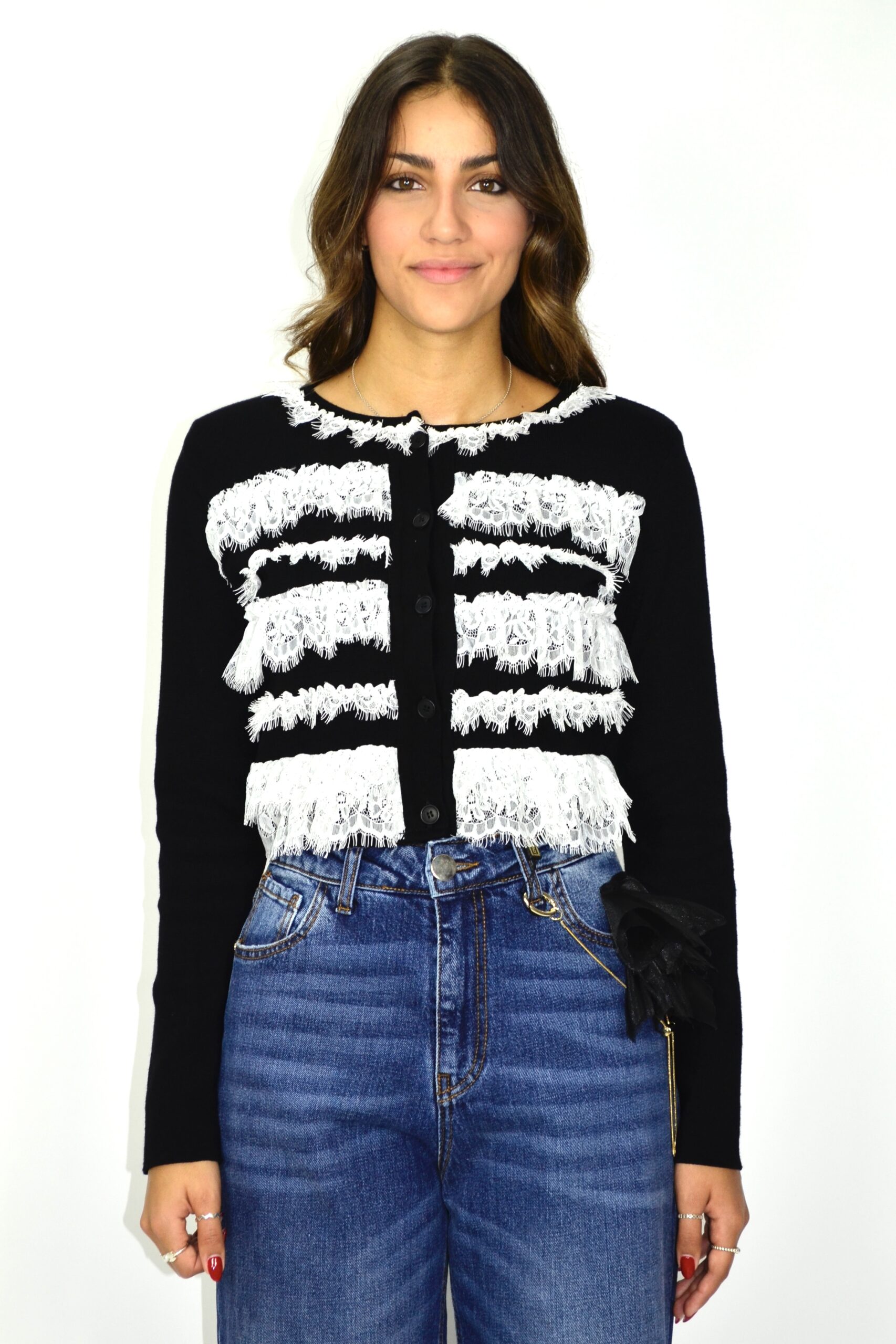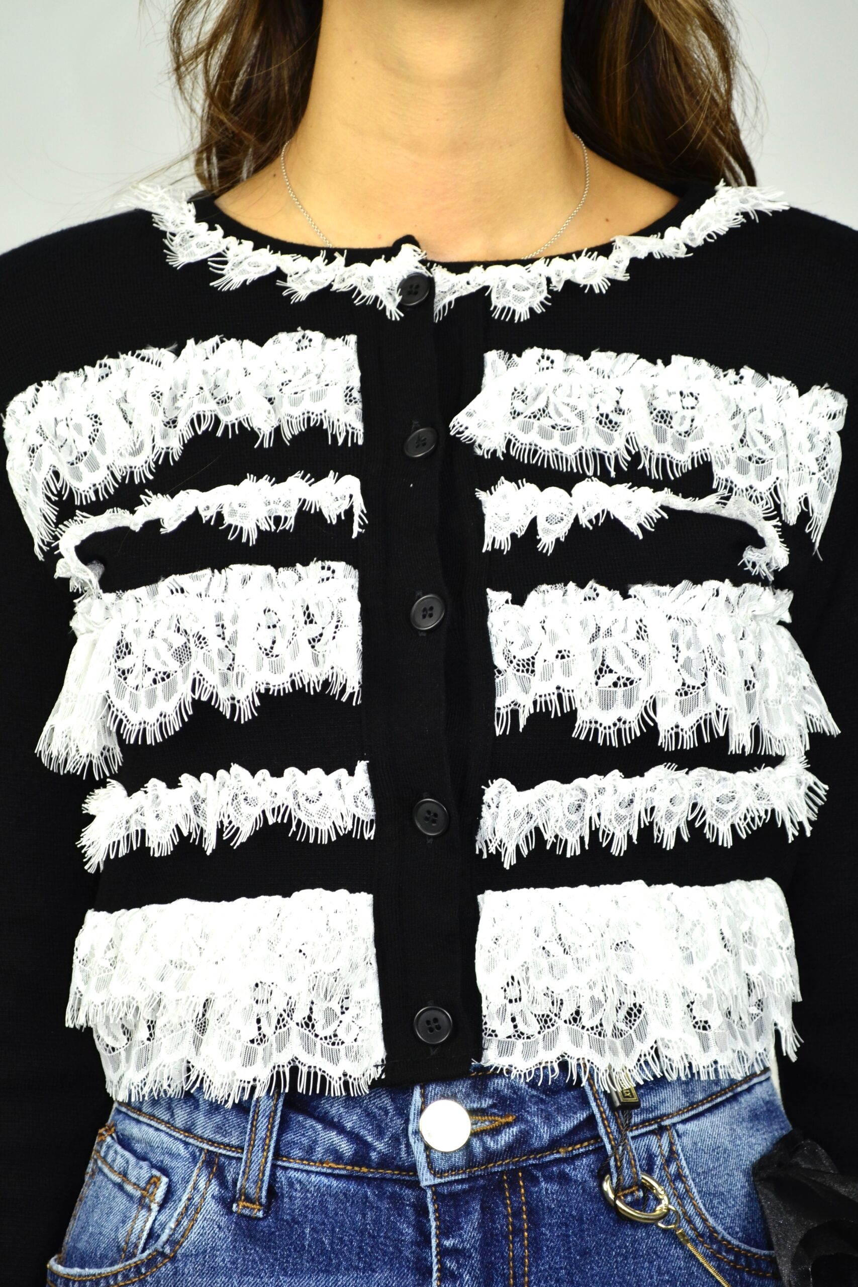 Cardigan em malha preta com aplicação de renda branca em faixas horizontais. O contraste entre o preto sólido e a delicadeza da renda cria um visual marcante e feminino, com uma estética que mistura romantismo e irreverência. Fecho frontal com botões e corte curto, ideal para coordenar com jeans ou peças de cintura subida, num look contemporâneo e cheio de personalidade.