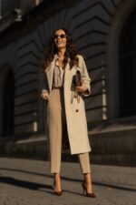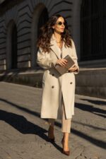 Casaco longo em lã estruturada num tom bege suave, com superfície lisa que cria um aspeto polido e luminoso. O modelo apresenta lapelas amplas, botão duplo frontal de destaque e corte reto que acompanha naturalmente a linha do corpo. A construção reforçada nos ombros acrescenta presença visual, enquanto a fluidez da lã garante movimento confortável ao caminhar. A peça inclui bolsos laterais discretos e forro interno que mantém a silhueta impecável.