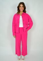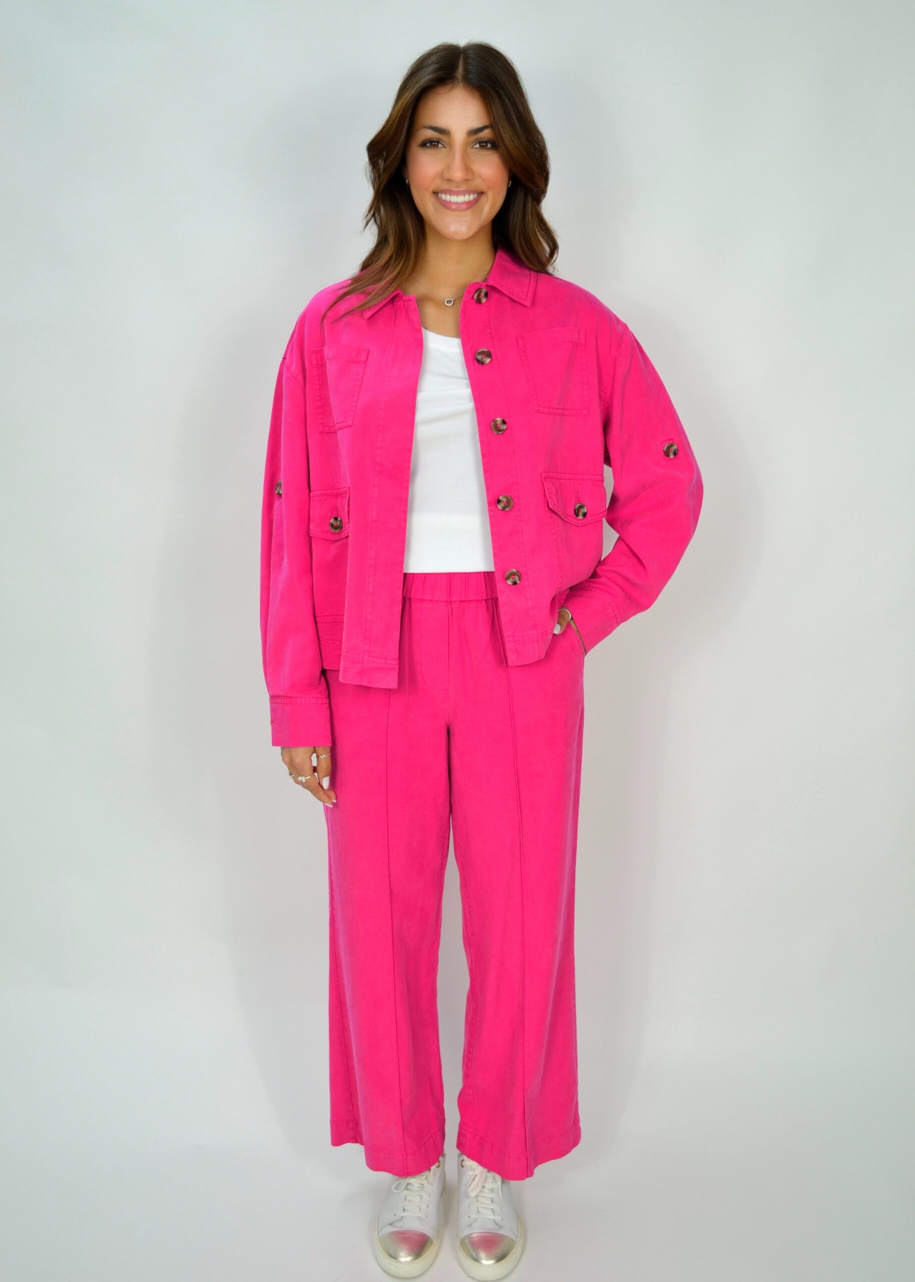 Casaco curto em tecido estruturado fúcsia, com superfície lisa e corte direito ligeiramente amplo. O modelo apresenta gola clássica e fecho frontal com botões de efeito tartaruga que acrescentam contraste. Os bolsos aplicados no peito e na parte inferior reforçam a funcionalidade e a estética utilitária. A construção leve permite liberdade de movimento e um ajuste confortável. Ideal para coordenar em conjunto ou com peças neutras, criando um look contemporâneo e de forte impacto visual.