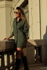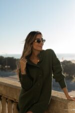 Casaco em malha de algodão verde-tropa com textura grossa e estrutura ligeiramente oversize. Apresenta gola alta dobrável, fecho frontal com botões e detalhe canelado nas mangas e na barra. As mangas longas com volume controlado e o comprimento alongado conferem conforto e versatilidade. Perfeito para usar como peça única com botas altas ou sobre um vestido fluido em coordenados de meia-estação.
