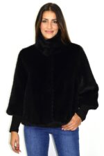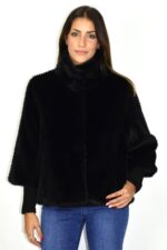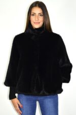 Casaco curto em pelo sintético preto de textura densa e toque ultra macio. Apresenta gola subida, fecho frontal oculto e punhos em malha canelada que criam contraste e definem a silhueta. Um modelo elegante e versátil, perfeito para coordenar com jeans ou peças mais formais, garantindo conforto e sofisticação.