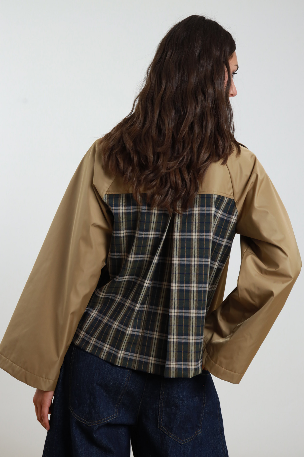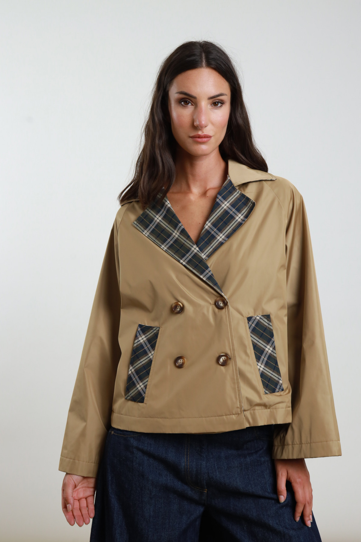 Casaco curto em tecido leve bege. Fecho cruzado com botões frontais. Gola e bolsos com detalhe em padrão xadrez nas cores verde, azul e branco. Corte reto e descontraído.