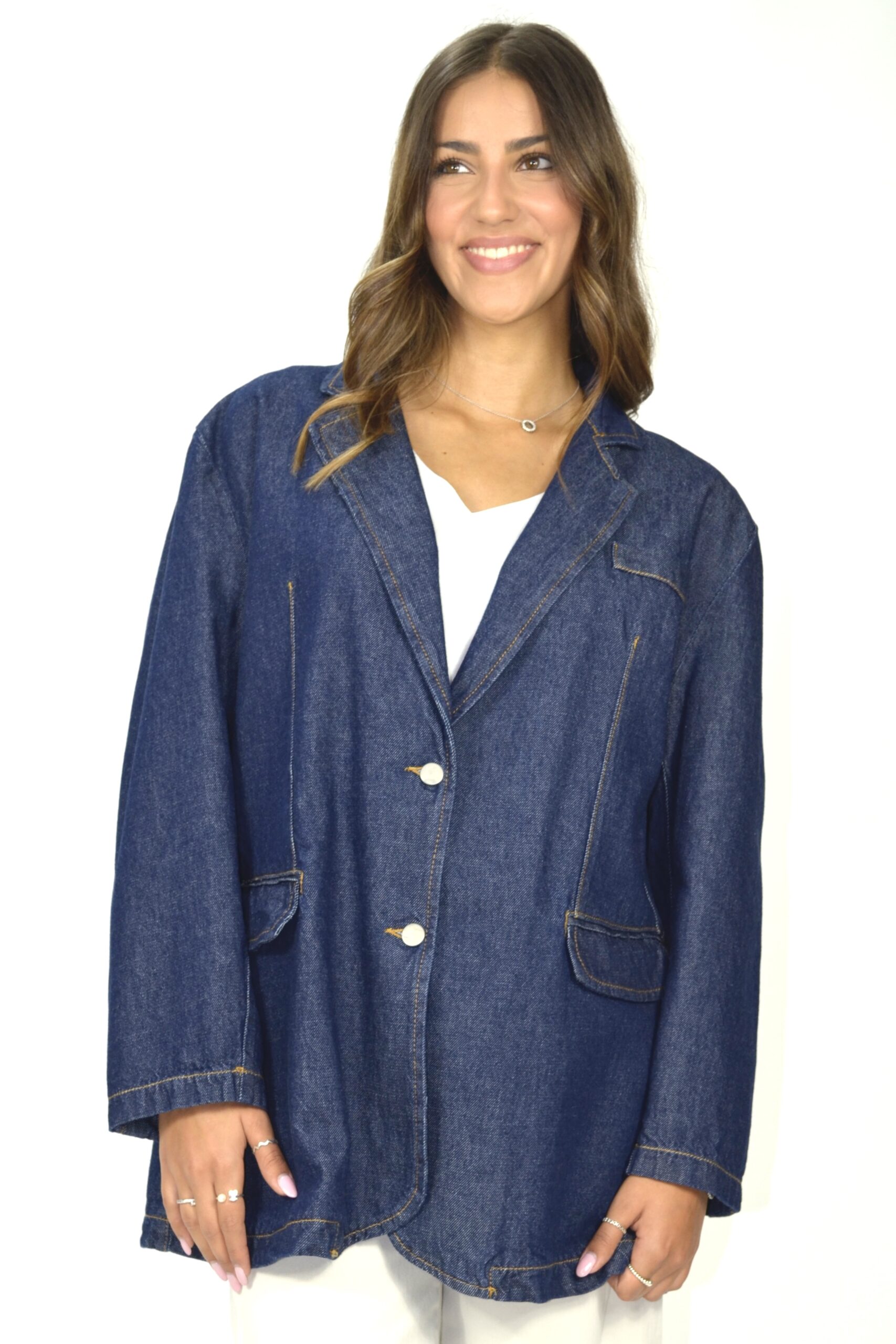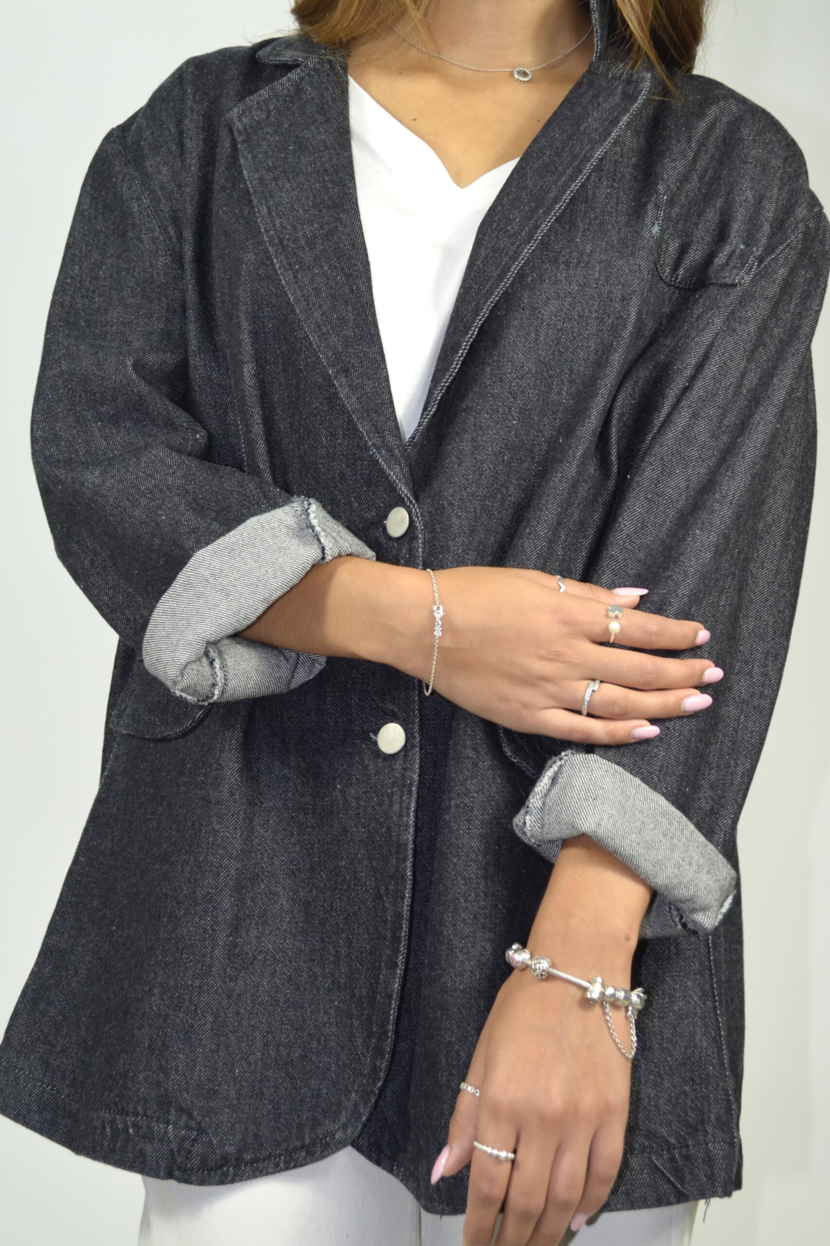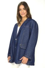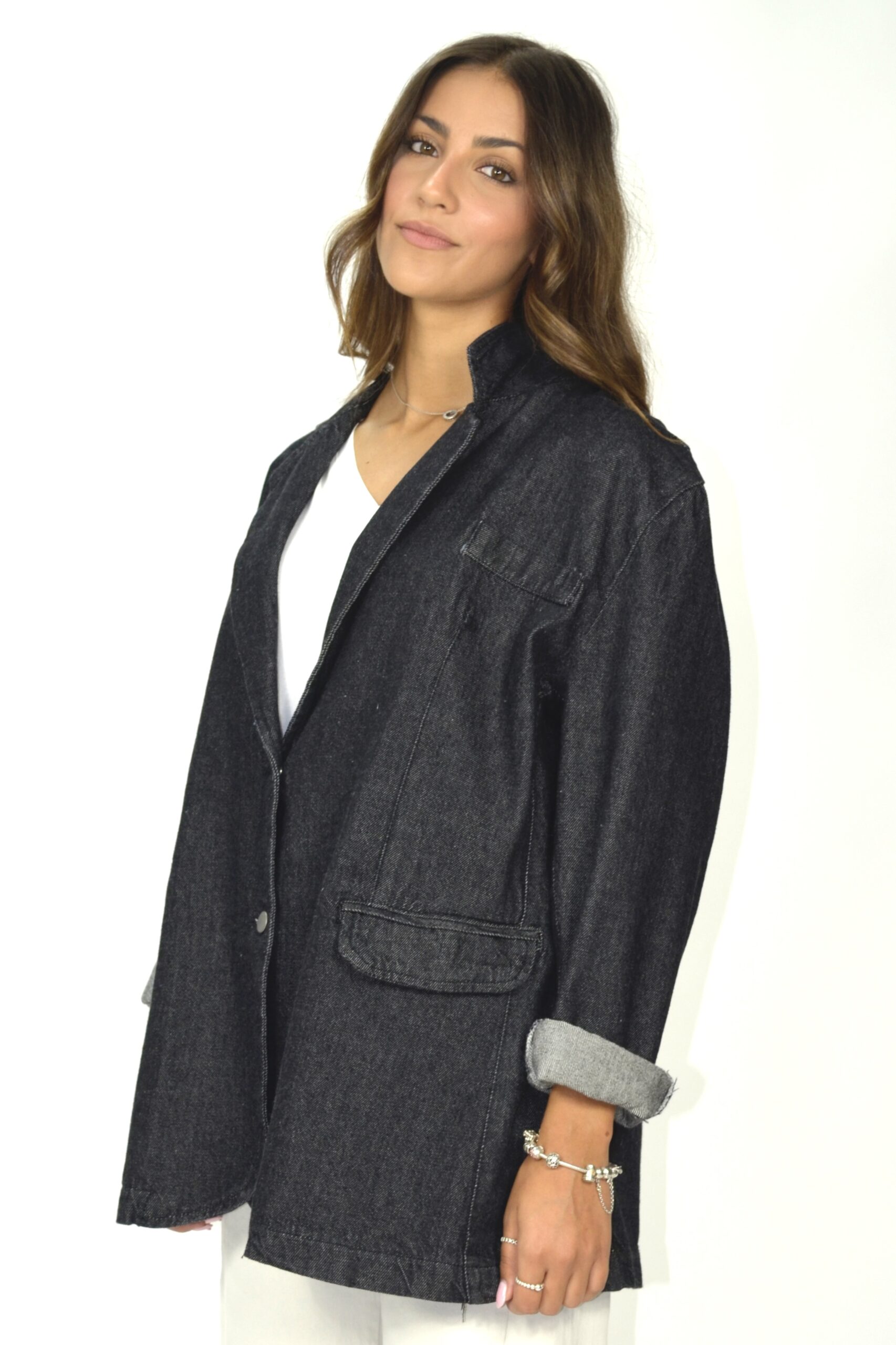 Blazer em ganga com corte reto. Fecho frontal com dois botões metálicos. Lapelas clássicas e costuras em contraste. Bolsos frontais com aba. Tecido estruturado e confortável, ideal para um visual descontraído com toque urbano.