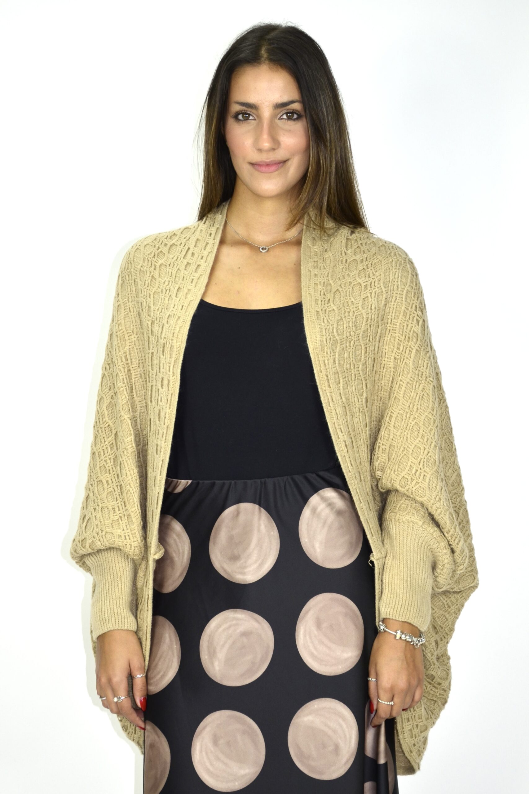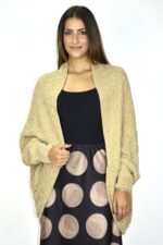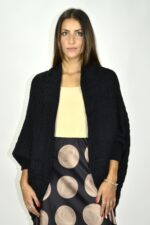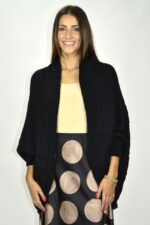 Casaco em malha de ponto rendado com corte tipo capa e mangas morcego. O tecido é suave e volumoso, com gola larga e punhos canelados que conferem estrutura à silhueta fluida. Ideal para sobrepor em coordenados elegantes ou descontraídos, acrescentando textura e conforto ao look.