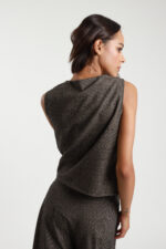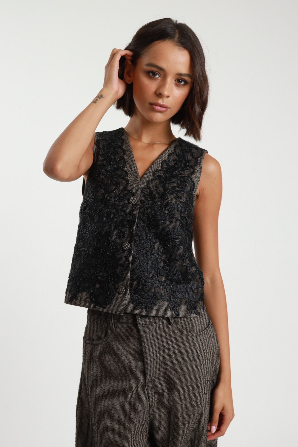 Colete em tecido estruturado castanho com padrão microxadrez. Aplicação de renda preta bordada na frente. Decote em V e fecho com botões forrados. Corte reto e sem mangas. Peça versátil que combina textura e detalhe artesanal.