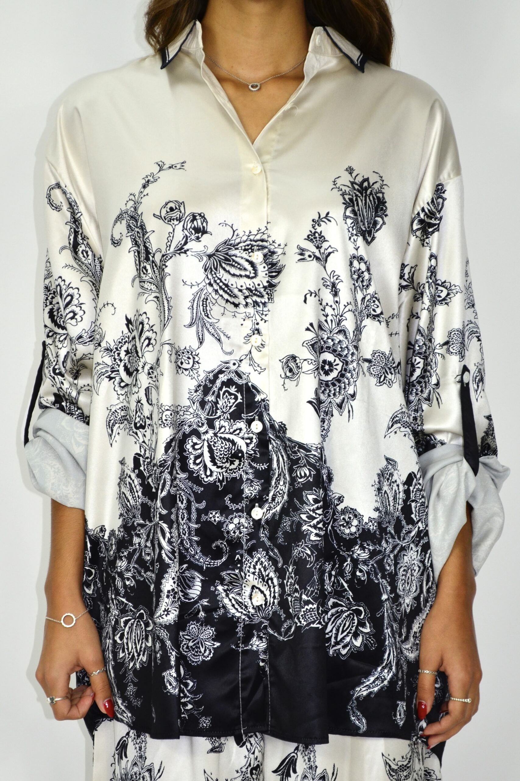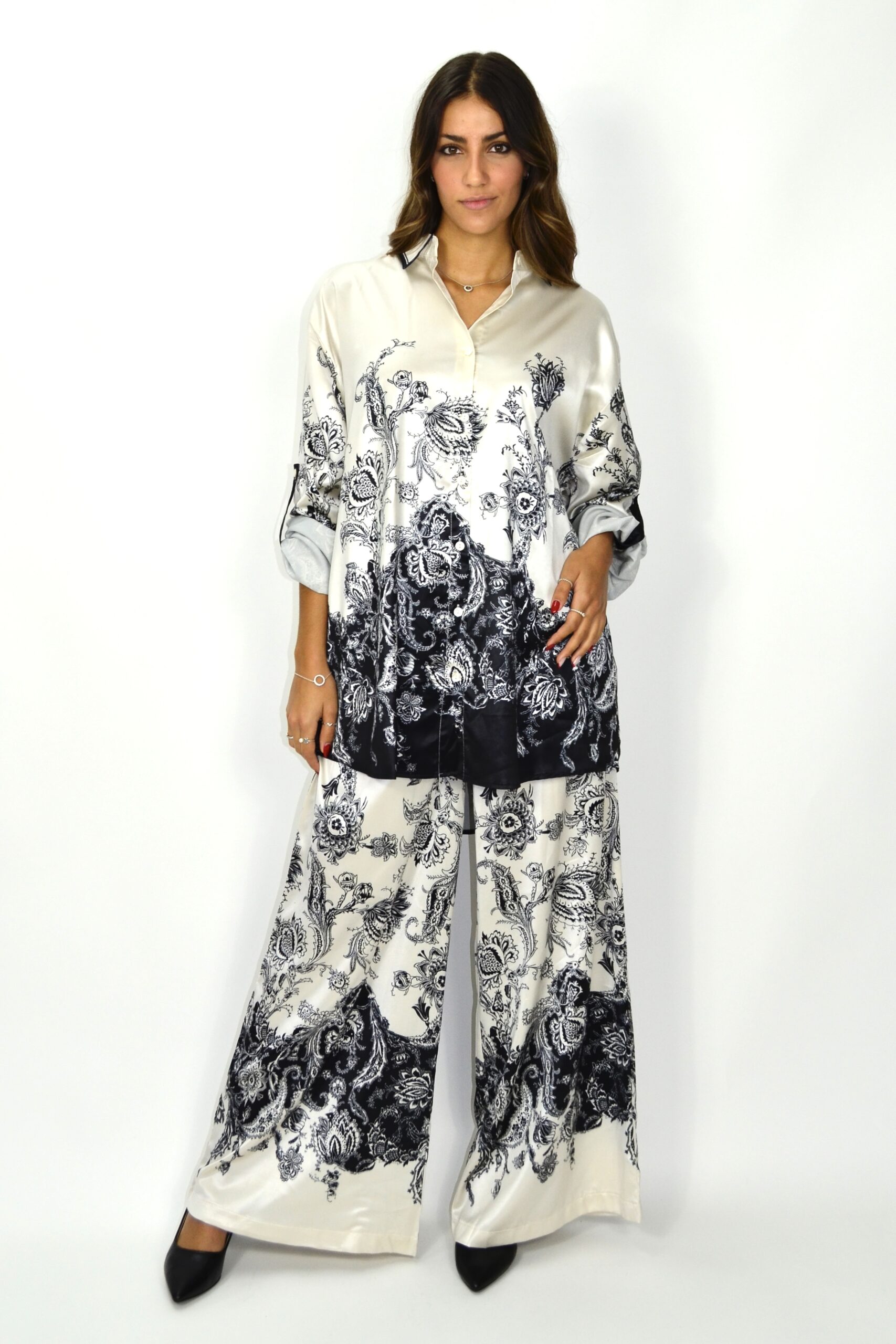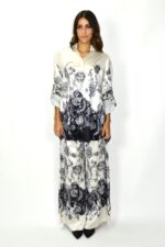 Conjunto em cetim acetinado com estampado paisley em preto sobre fundo marfim. A túnica de corte solto apresenta gola clássica, botões frontais e mangas compridas com presilha ajustável. As calças amplas têm cintura elástica e caimento fluido que acompanha o movimento.