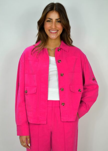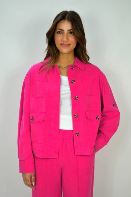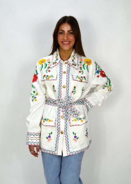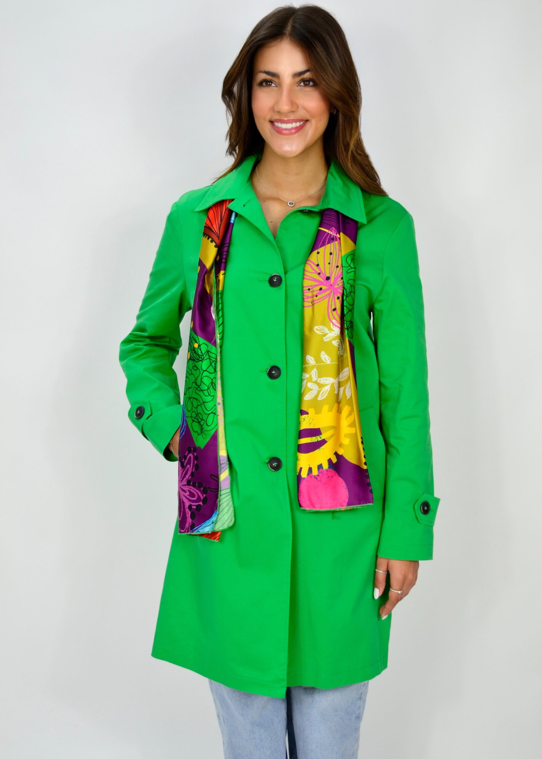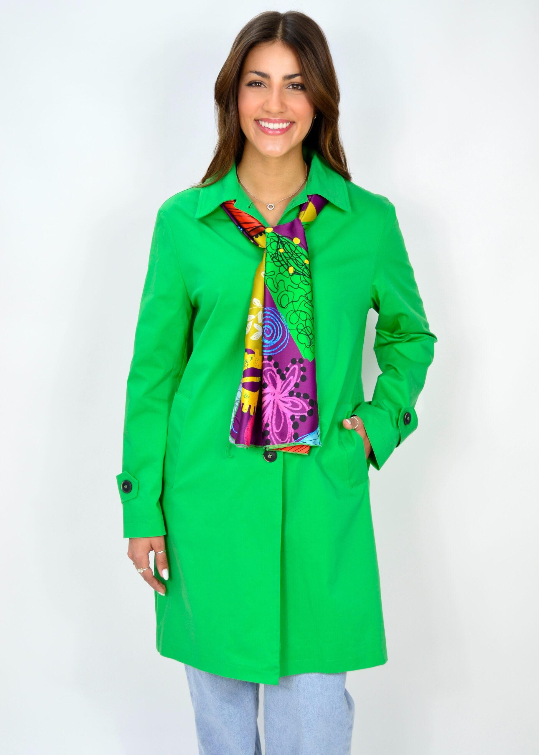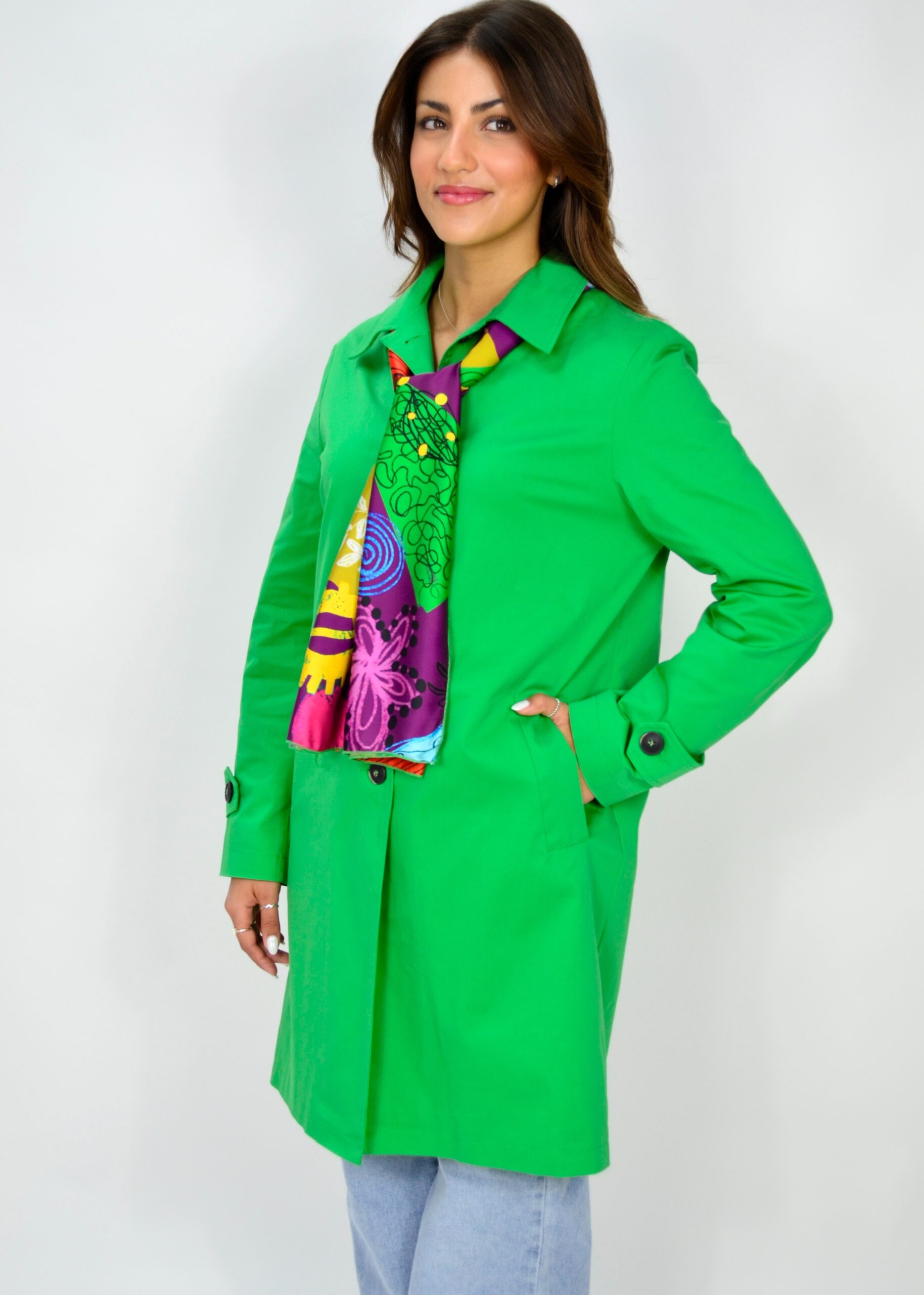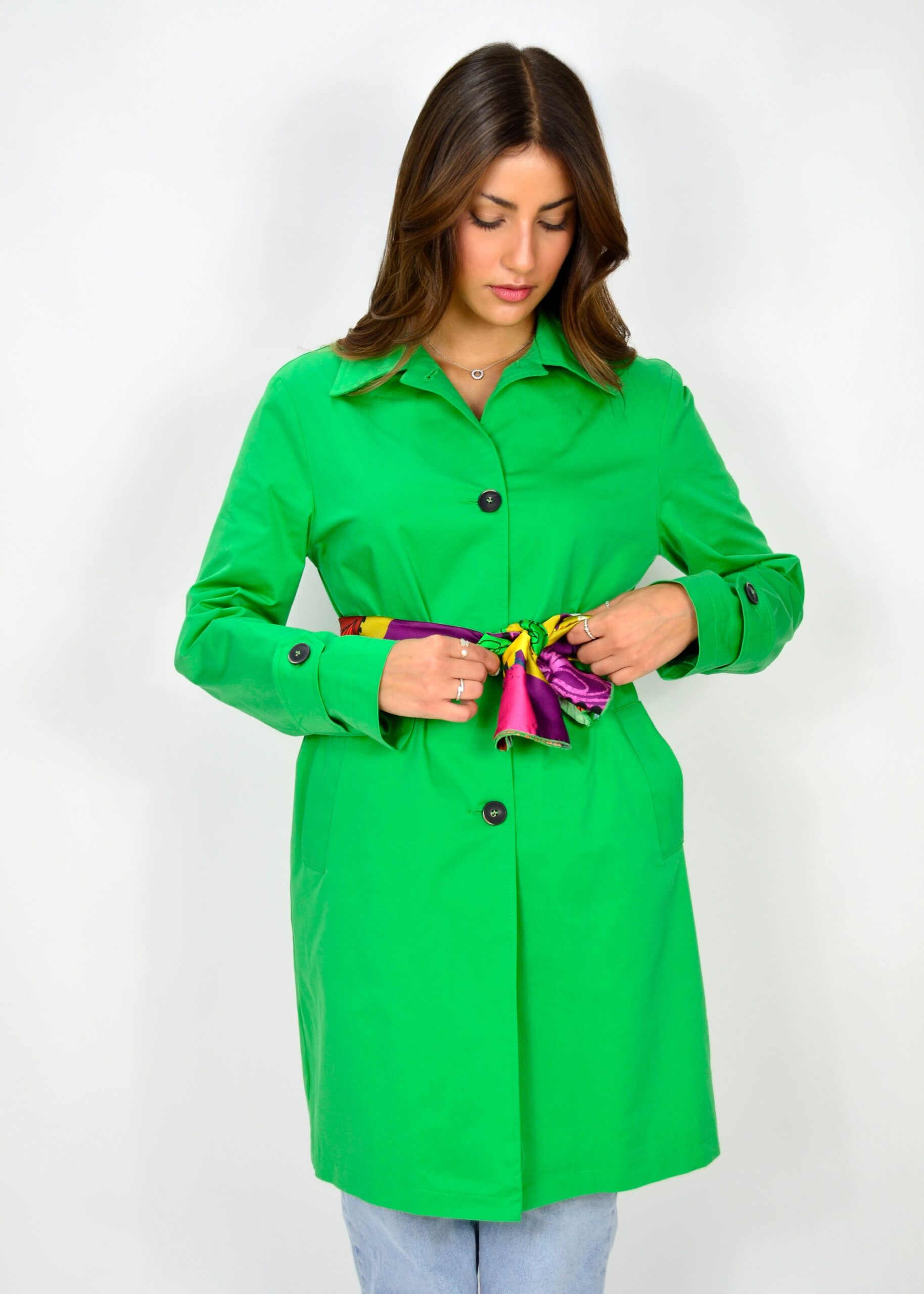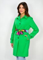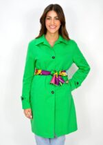 Casaco midi em tecido estruturado verde vibrante, com superfície lisa e construção minimalista. A gola clássica e o fecho frontal com botões criam uma linha contínua e refinada. Os bolsos laterais integram-se de forma discreta na silhueta. A faixa colorida na cintura, com padrão contrastante, introduz um ponto de destaque e permite ajustar o volume ao corpo, garantindo conforto e definição. Ideal para coordenar com denim ou looks neutros, elevando o conjunto com um toque gráfico e contemporâneo.