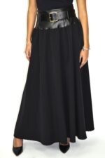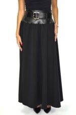 Saia comprida preta com cintura alta em imitação de pele e cinto largo integrado com fivela metálica. A saia tem corte fluido em tecido leve e movimento elegante, criando um contraste entre a estrutura firme da cintura e a suavidade do corpo da peça.