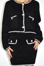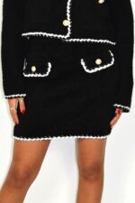 A mini saia ajustada complementa o conjunto com elegância e proporção equilibrada. Este coordenado inspira-se no estilo parisiense intemporal, perfeito para ocasiões em que se pretende um look feminino, sofisticado e com personalidade.