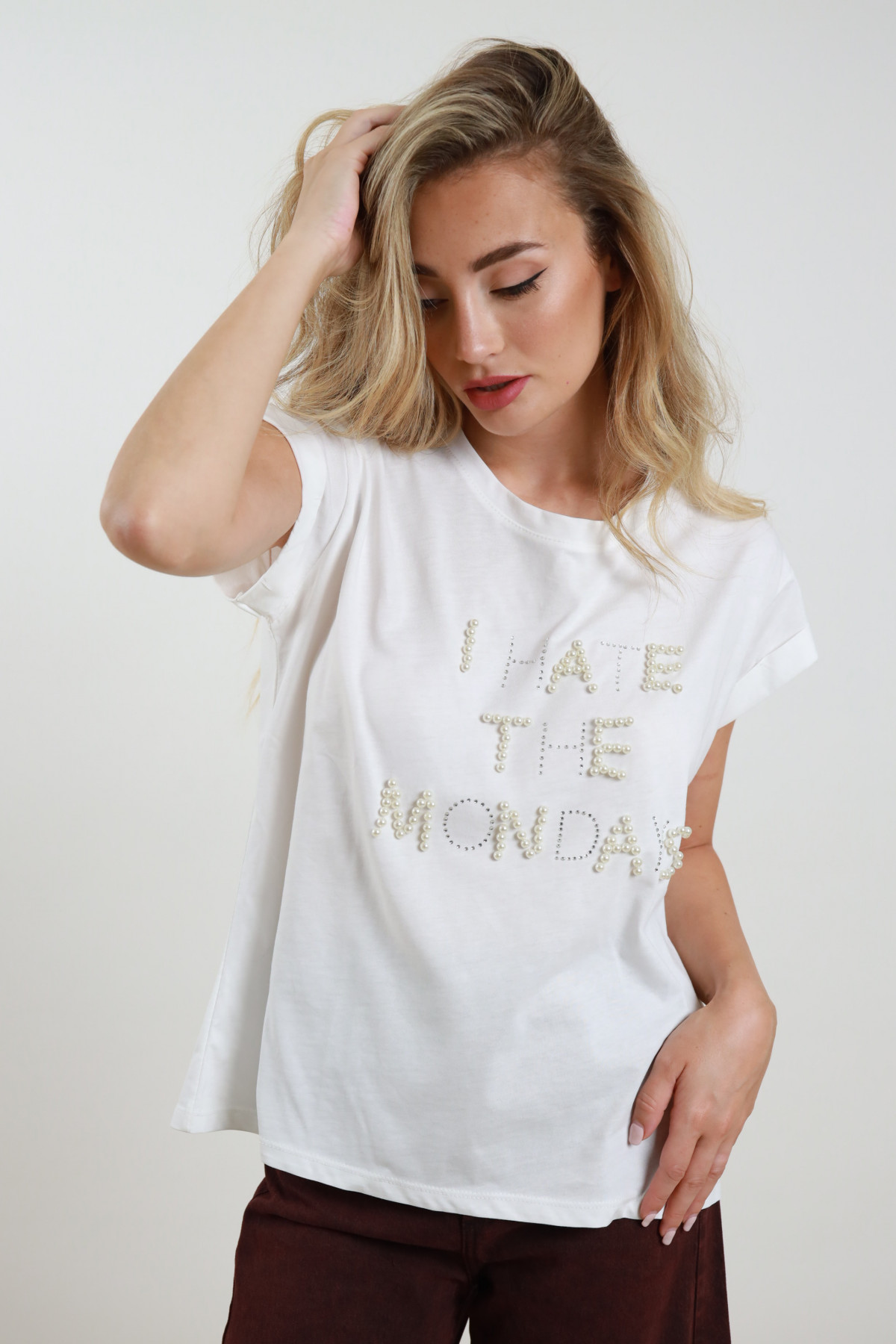 T-shirt em algodão branco com corte reto. Decote redondo e mangas curtas dobradas. Aplicação frontal com frase “I HATE THE MONDAY” decorada com pérolas.