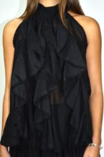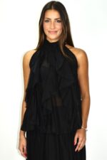 Blusa em tecido leve preto com gola subida e fecho nas costas. Modelo sem mangas com aplicação de folhos frontais em camadas de corte fluido e ligeiramente transparente, que confere movimento e elegância.