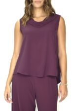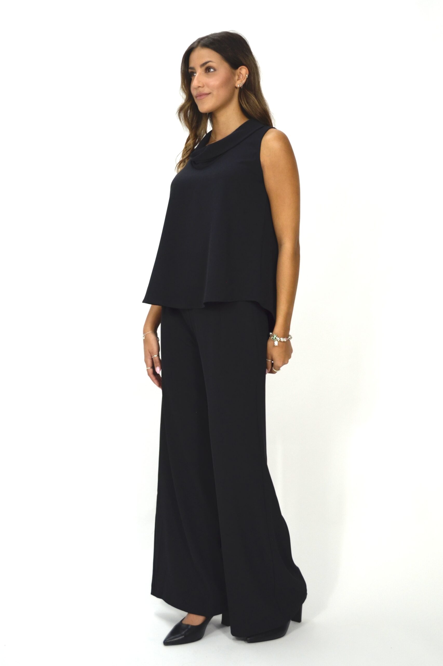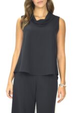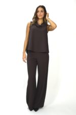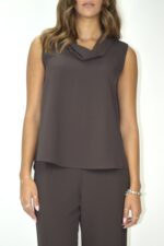 Top sem mangas em tecido fluido castanho-chocolate, com gola drapeada que cria um caimento elegante e natural. O corte direito e o acabamento suave conferem movimento e leveza à peça. Ideal para coordenar com calças de alfaiataria ou saias midi, resultando num look sofisticado e intemporal.