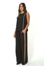 Top sem mangas em tecido fluido preto, com detalhe em faixa bege aplicada na diagonal à frente e prolongada lateralmente. O design minimalista ganha movimento e contraste através desse pormenor gráfico. Corte solto e elegante, ideal para coordenar com calças fluidas no mesmo tom, criando um look contemporâneo, equilibrado e visualmente alongado.