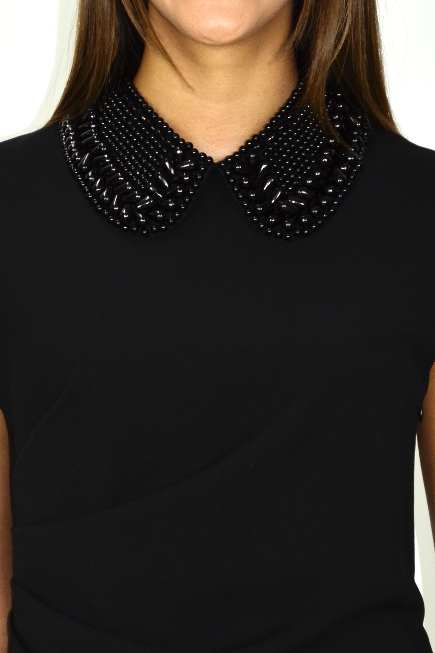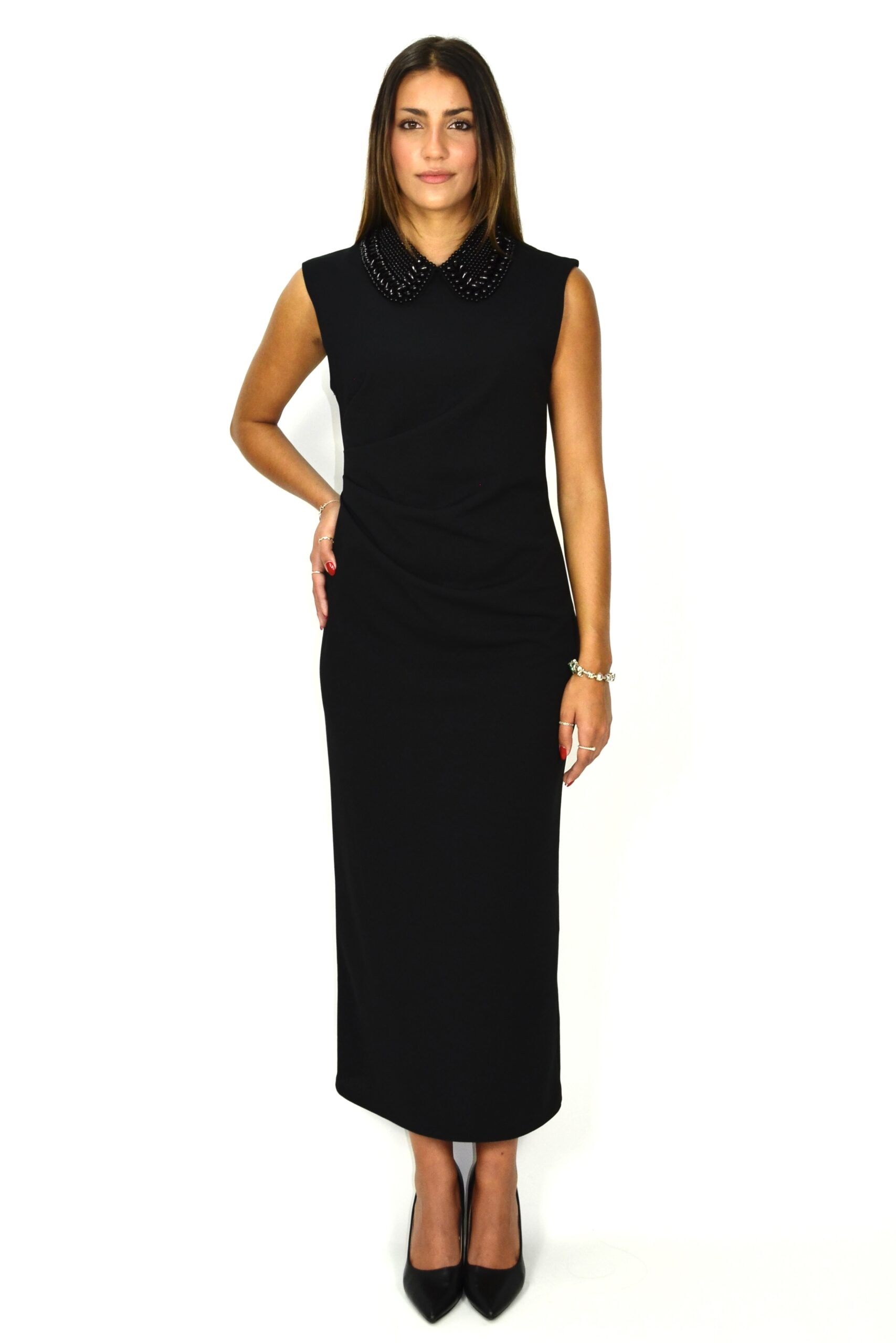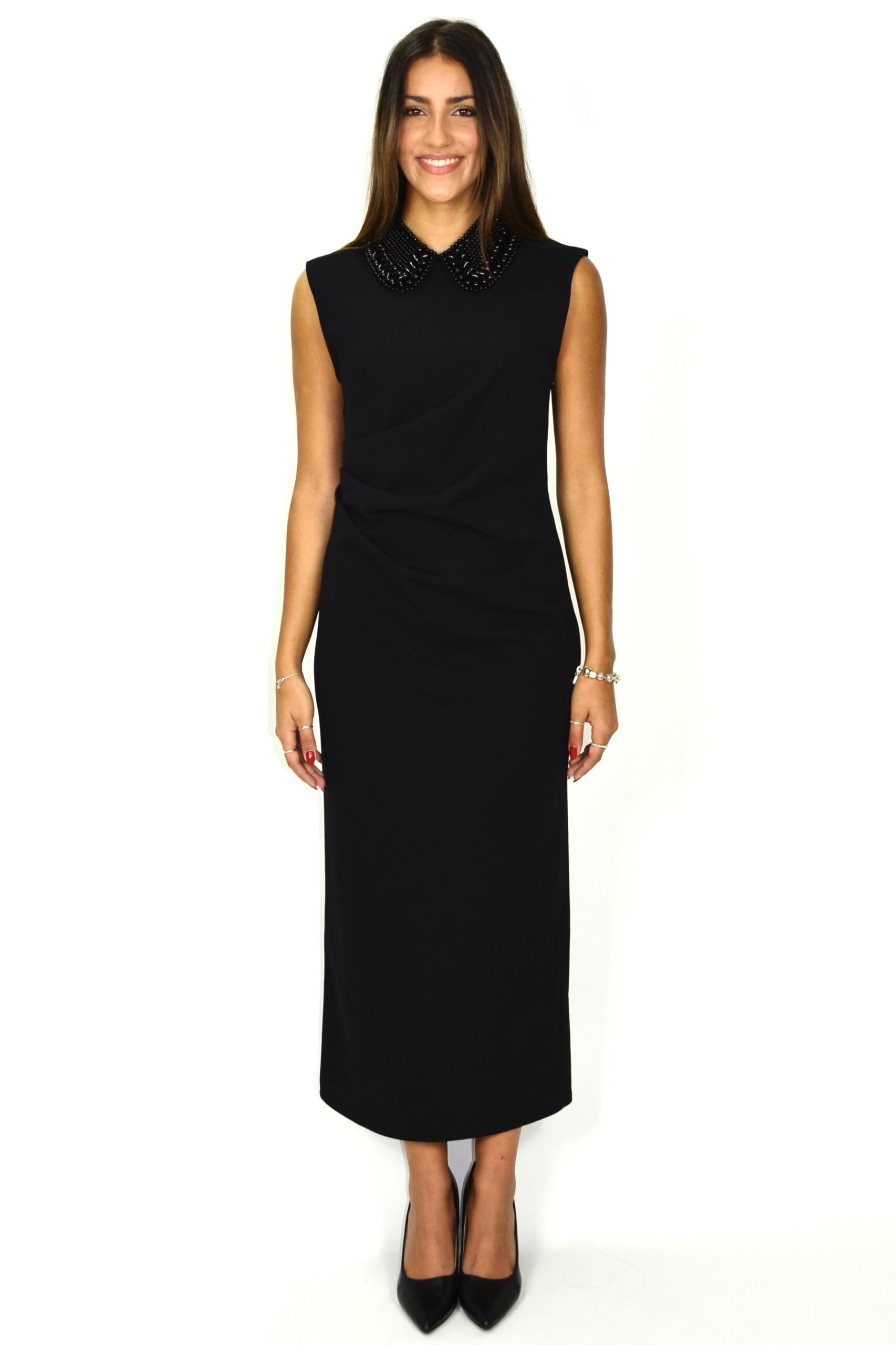Vestido comprido em tecido crepe preto, sem mangas e com gola de camisa decorada com aplicação de missangas pretas. Corte reto e ligeiramente ajustado à silhueta com fecho invisível nas costas.