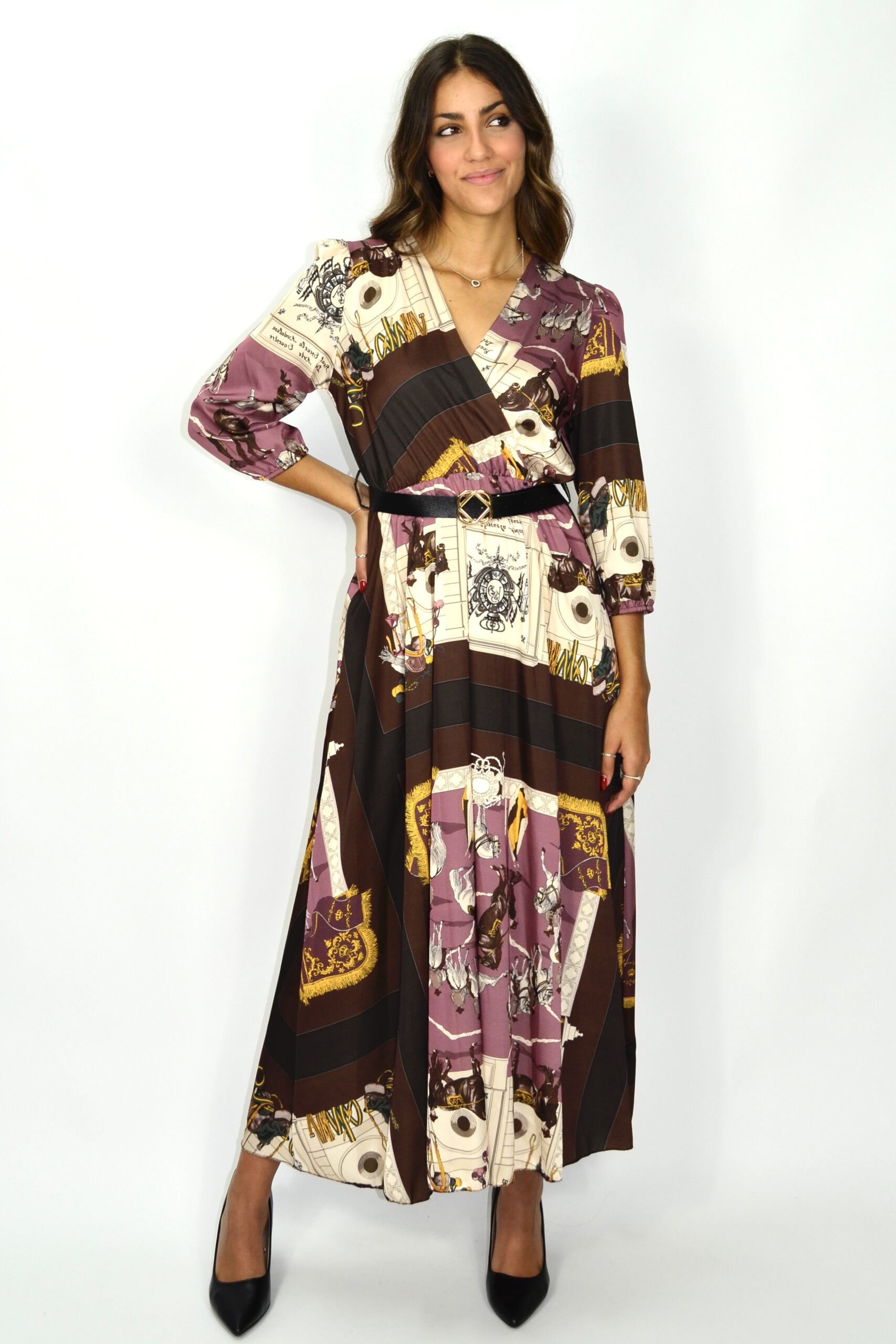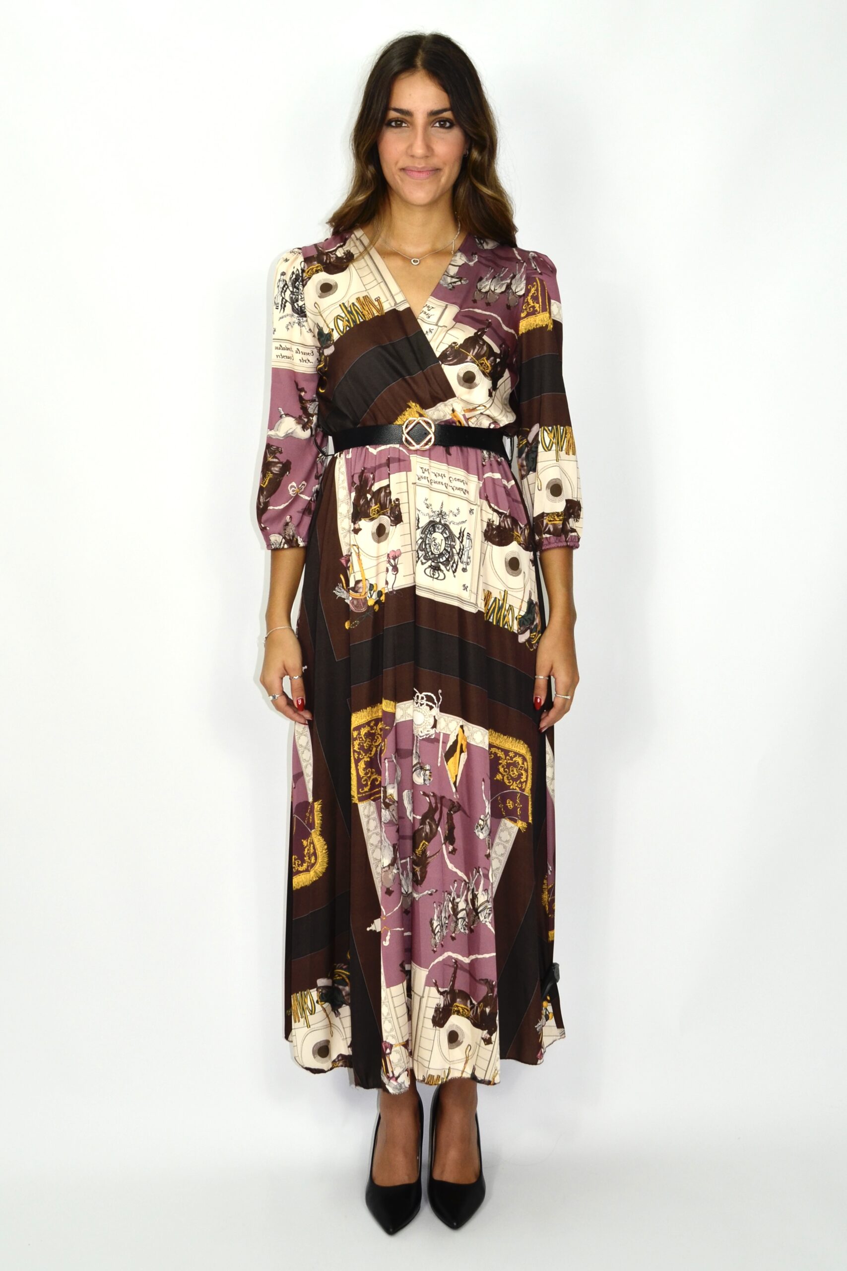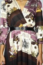 Vestido comprido em padrão gráfico inspirado em lenço, com tons de lilás, castanho, bege e dourado. O modelo apresenta decote em “V” cruzado, mangas 3/4 com punho elástico e corte fluido que acompanha o movimento do corpo. A cintura é marcada por um cinto preto com fivela dourada, criando uma silhueta equilibrada e elegante.
