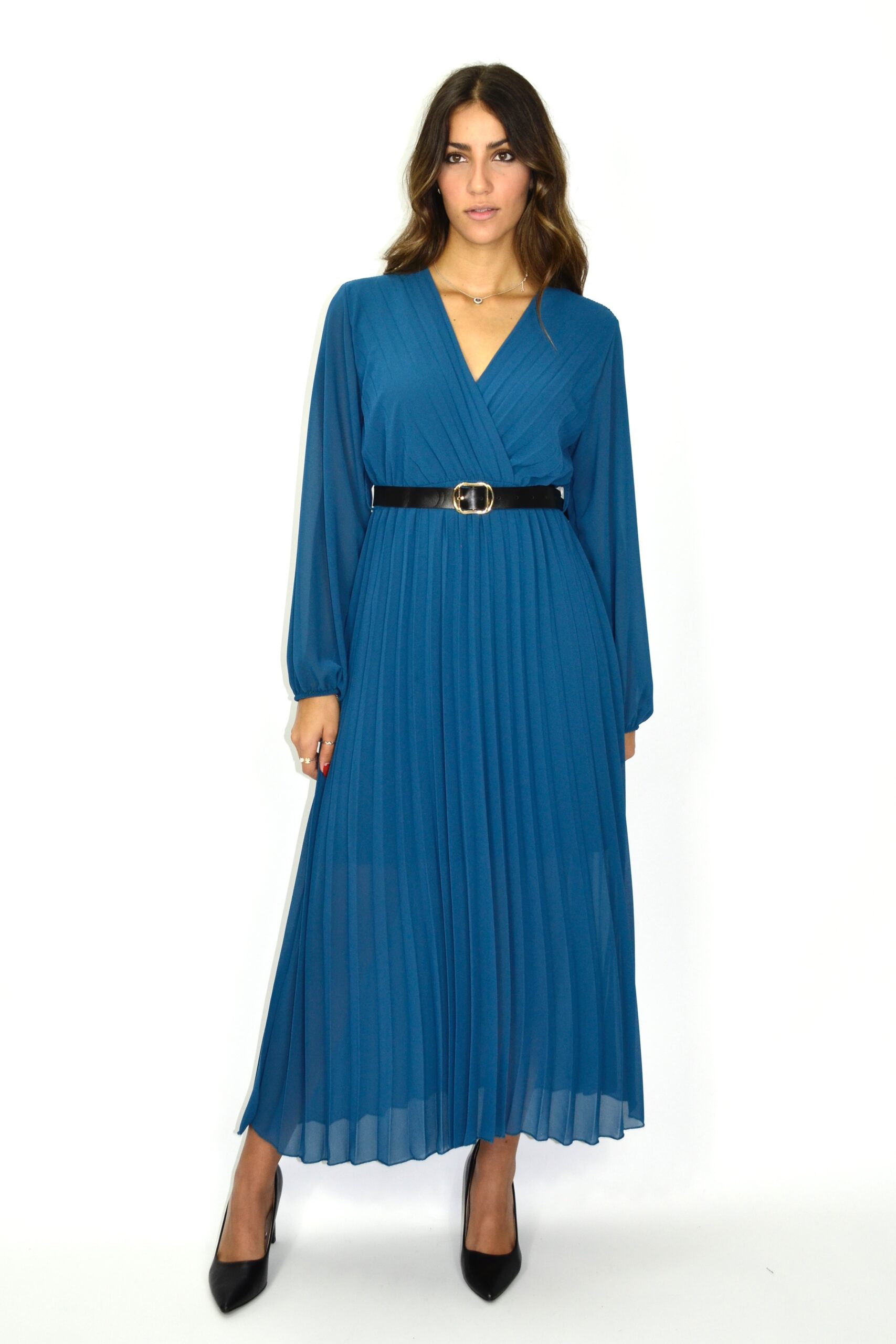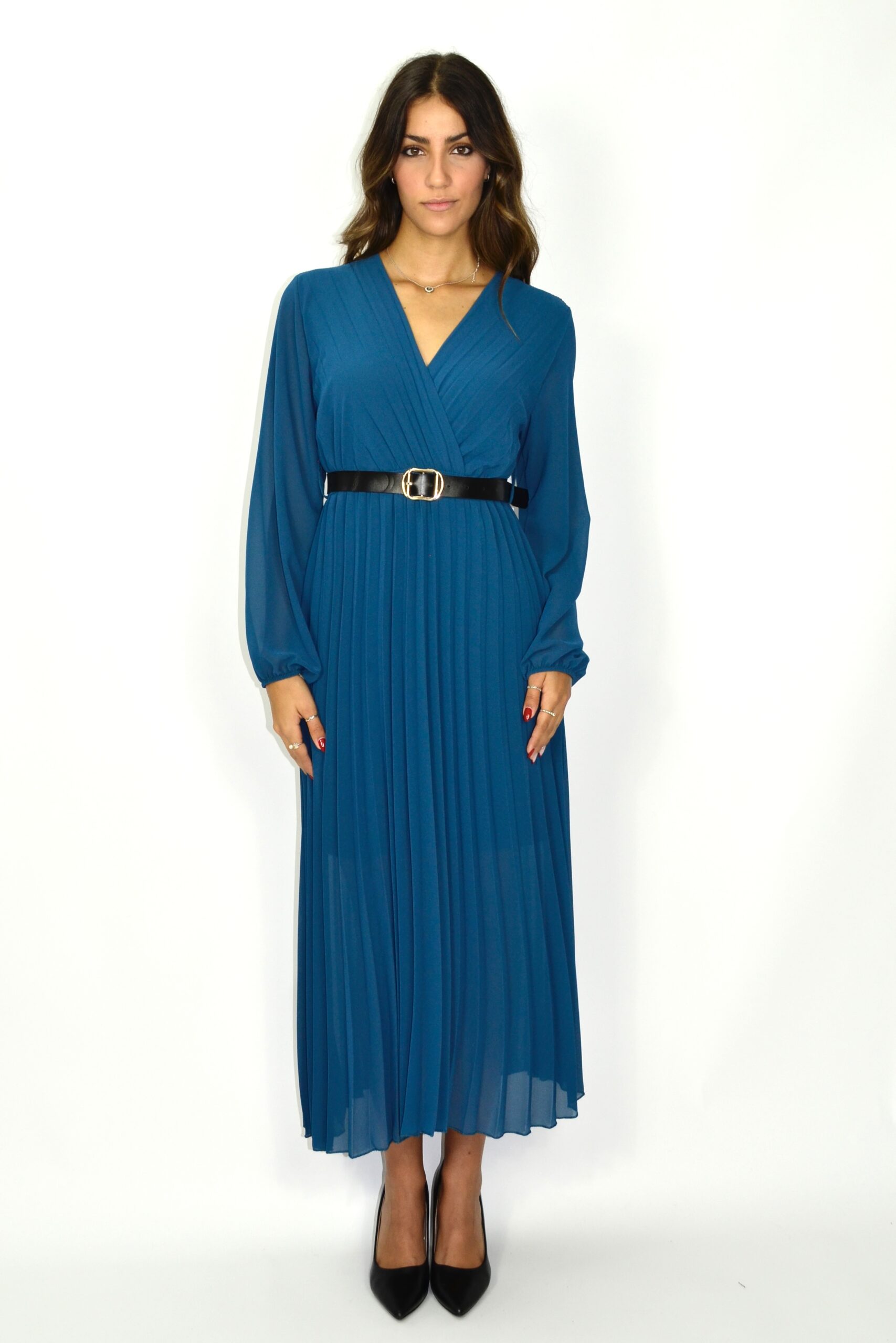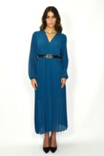 Vestido midi plissado em tom azul petróleo, de corte elegante e fluido. O modelo apresenta decote em “V” cruzado e manga comprida ligeiramente abalonada, terminando em punho elástico subtil. A cintura é realçada por um cinto preto com fivela dourada, que acrescenta contraste e estrutura ao look. A saia plissada confere movimento e leveza, criando uma silhueta feminina e sofisticada. Ideal para eventos, jantares ou ocasiões especiais, combinando conforto com requinte moderno.